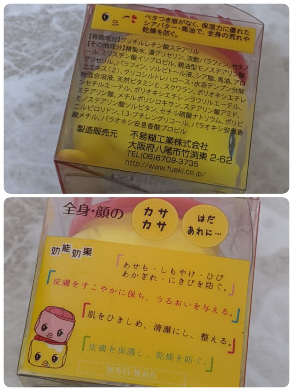 可愛くて懐かし〜。ドンキで半額くらいになってたから思わず買ってしまいました。無香料・無着色、馬油・シアバター配合。全身に使えるそうです。 プルプルのテクスチャーで私はお尻とかお腹とかに使ってます。足とかは香りがあるやつにしてます。 あせも・しもやけ・ひび・あかぎれ・にきびを防ぐ。皮膚をすこやかに保つ。皮膚にうるおいを与える。