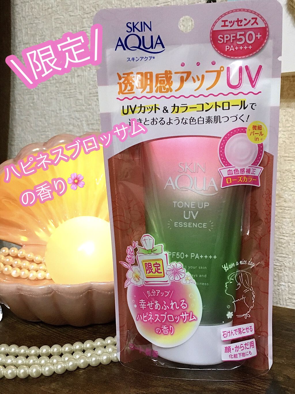 - ※カラー名称「ハピネスオーラ」は「ローズ」へ名称変更となりました。 <ミントグリーン> 赤み補正*1!UVカットしながら、色と光をコントロールし、肌をトーンアップ*1。 ミントグリーンカラーで透き通るような素肌つづく!エッセンスタイプの日焼け止め。 透明感*1のある肌に。 SPF50+、PA++++、UV耐水性★★。 鉱物油フリー。パラベンフリー。ときめくサボンの香り。 <ラベンダー> 明るさ補正*1!UVカットしながら、色と光をコントロールし、肌をトーンアップ*1。 透明感*1を引き出すラベンダーカラーの日焼け止め。 すーっとのびて、みずみずしい使い心地のエッセンスタイプ。 SPF50+、PA++++、UV耐水性★★。 鉱物油フリー。パラベンフリー。ときめくサボンの香り。 <ローズ> 血色感補正*1!UVカットしながら、色と光をコントロールし、肌をトーンアップ*1。 ローズカラーで血色をプラスし、透明感*1のある肌に。 エッセンスタイプの日焼け止め。 SPF50+、PA++++、UV耐水性★★。 パラベンフリー。ハピネスブロッサムの香り。 <ブルー> UVカットしながら、色と光をコントロールし、肌をトーンアップ*1。 血色感を抑えて儚げな色白肌*1に見せるブルーカラーの顔・からだ用日やけ止め。すーっとのびて、みずみずしい使い心地。 透明感ブルー×透明感ホワイト=はかなげブルーカラーで、自分史上最高*2の色白肌*1、うるおう美容液成分(うるおい成分)としてヒアルロン酸Na、ビタミンC誘導体*3配合。 SPF50+/PA++++。こころがときめくサボンの香り。化粧下地にも。石けんで落とせます。 パラベンフリー。鉱物油フリー。アレルギーテスト済み(全ての方にアレルギーが起こらないというわけではありません)。 *1:メイクアップ効果による *2:スキンアクアシリーズにおいて *3:リン酸アスコルビルMg(うるおい成分)