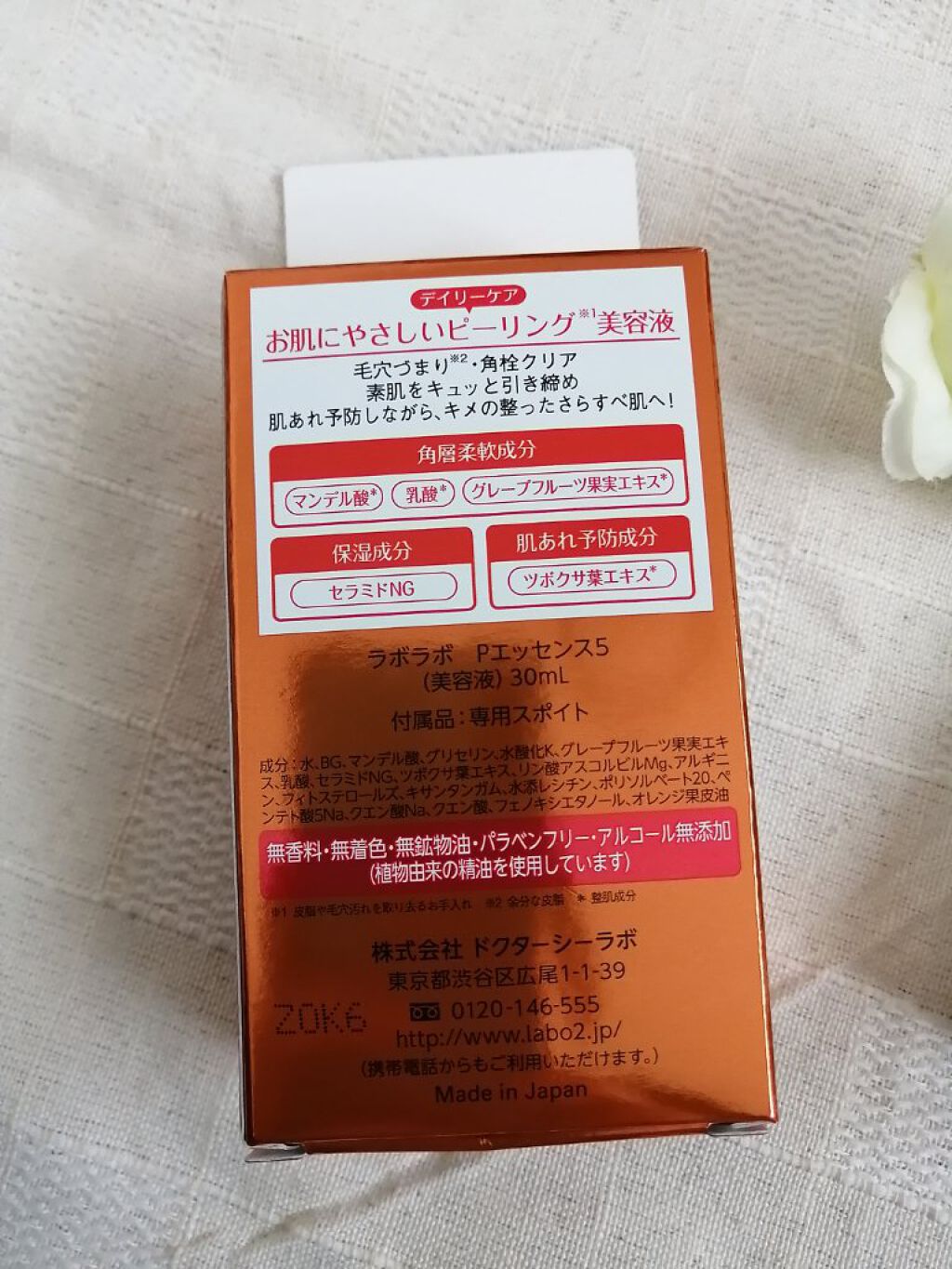 - No.1毛穴ケアブランドラボラボから、肌悩みに合わせて選べる新発想のピーリング美容液が誕生。 クリニックで人気の施術「ミルクピール」を応用し、ホームケアできるように開発しました。角質ケア成分の濃度と、異なる美容液成分の組み合わせで、3タイプからお選びいただけます。 ------------------------------------- ◆スーパー毛穴ピールセラム3(肌悩みレベル★★★) ピールセラム3種共通成分マンデル酸*1に加え、ヒアルロン酸*2・水溶性コラーゲン*3配合で、保湿ケア、毛穴の詰まり、肌のざらつきまで、これ一本でアプローチ。お肌をキュッと引き締め、化粧ノリが良い、キメの整ったうるおいつるん肌へ。 ◆スーパー毛穴ピールセラム5(肌悩みレベル★★★★★) ピールセラム3種共通成分マンデル酸*1に加え、セラミド*4、肌あれ予防成分*5配合で、保湿ケア、毛穴の詰まり、角栓、肌あれ、キメの乱れまで、これ一本でアプローチ。お肌の土台を整え、キメの整ったさらすべ肌へ。 ◆スーパー毛穴ピールセラム10(肌悩みレベル★★★★★★★) ピールセラム3種共通成分マンデル酸*1に加え、ナイアシンアミド*1配合で、保湿ケア、毛穴の詰まり・黒ずみ、角栓、肌あれ、キメの乱れ、疲れ肌、べたつき、ざらつき、凹凸、くすみまで、これ一本でアプローチ。週2・3度のスペシャルケアで、凹凸のないなめらかな肌へ。 ------------------------------------- 化粧水の後に塗るだけ!洗い流し不要で簡単ケアが可能に。 敏感肌の方も安心のやさしい使い心地で、毎日お使いいただけます。 スッと浸透するテクスチャーで、保湿~毛穴ケアまでマルチな効果を発揮します。さらに、安心してお使いいただける5フリー処方で、朝晩ご使用可能です。 無香料・無着色・無鉱物油・パラベンフリー・アルコール無添加 ※植物由来の精油を使用しています ※アレルギーテスト済み(すべての方にアレルギーが起きないというわけではありません) No.1毛穴ケアブランド=出典:富士経済「機能性化粧品マーケティング要覧2019-2020」スキンケア市場皮脂・毛穴ケアカテゴリーにおける2018年の実績 ピーリング=皮脂や毛穴汚れを取り去るお手入れ 黒ずみ=毛穴汚れのこと 疲れ肌=くすんで見える肌状態のこと くすみ=古い角質によりくすんで見えること 浸透=角層まで *1 整肌成分 *2 ヒアルロン酸Na(保湿成分) *3 保湿成分 *4 セラミドNG(保湿成分) *5 ツボクサ葉エキス(整肌成分)