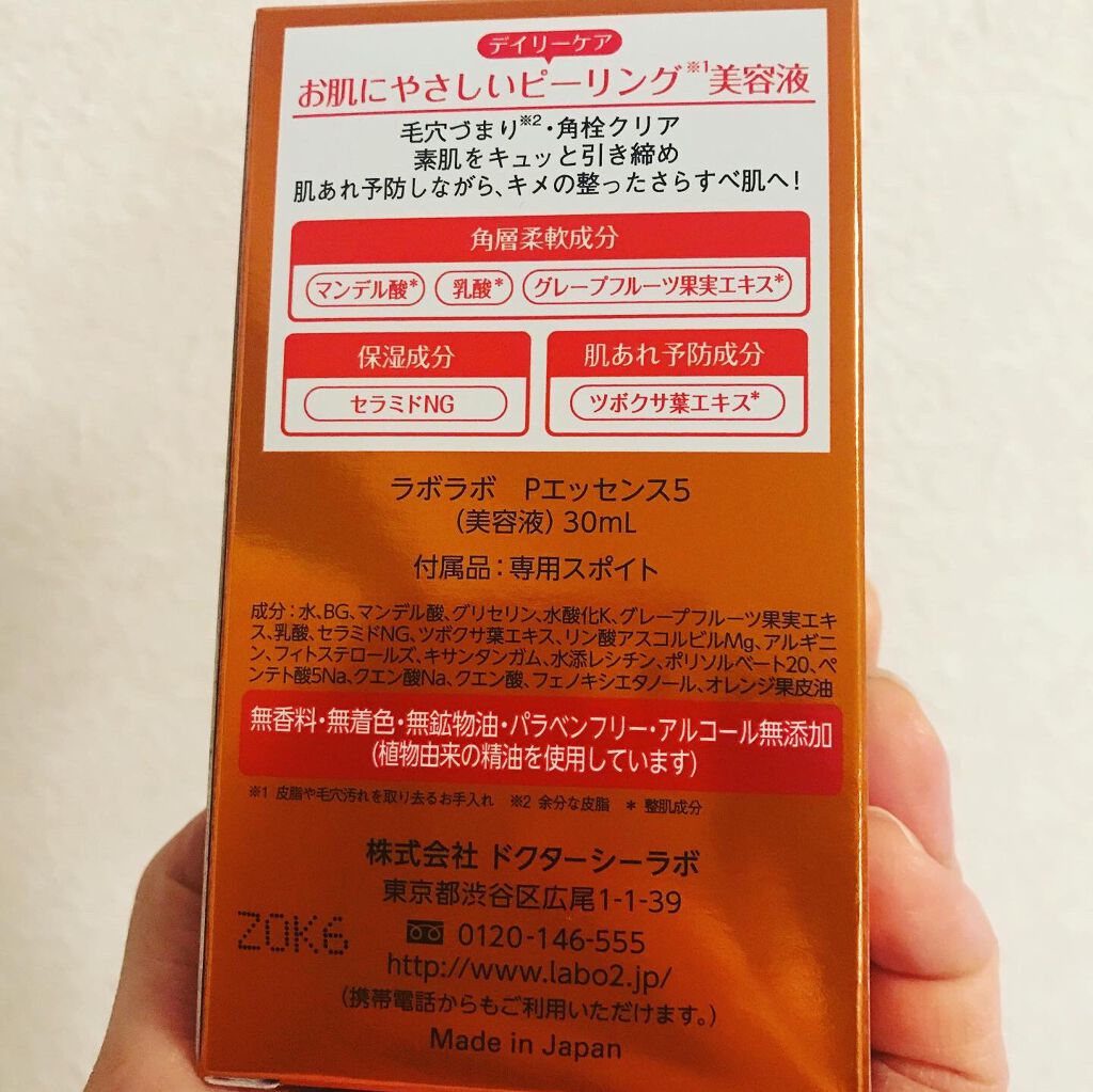 - No.1毛穴ケアブランドラボラボから、肌悩みに合わせて選べる新発想のピーリング美容液が誕生。 クリニックで人気の施術「ミルクピール」を応用し、ホームケアできるように開発しました。角質ケア成分の濃度と、異なる美容液成分の組み合わせで、3タイプからお選びいただけます。 ------------------------------------- ◆スーパー毛穴ピールセラム3(肌悩みレベル★★★) ピールセラム3種共通成分マンデル酸*1に加え、ヒアルロン酸*2・水溶性コラーゲン*3配合で、保湿ケア、毛穴の詰まり、肌のざらつきまで、これ一本でアプローチ。お肌をキュッと引き締め、化粧ノリが良い、キメの整ったうるおいつるん肌へ。 ◆スーパー毛穴ピールセラム5(肌悩みレベル★★★★★) ピールセラム3種共通成分マンデル酸*1に加え、セラミド*4、肌あれ予防成分*5配合で、保湿ケア、毛穴の詰まり、角栓、肌あれ、キメの乱れまで、これ一本でアプローチ。お肌の土台を整え、キメの整ったさらすべ肌へ。 ◆スーパー毛穴ピールセラム10(肌悩みレベル★★★★★★★) ピールセラム3種共通成分マンデル酸*1に加え、ナイアシンアミド*1配合で、保湿ケア、毛穴の詰まり・黒ずみ、角栓、肌あれ、キメの乱れ、疲れ肌、べたつき、ざらつき、凹凸、くすみまで、これ一本でアプローチ。週2・3度のスペシャルケアで、凹凸のないなめらかな肌へ。 ------------------------------------- 化粧水の後に塗るだけ!洗い流し不要で簡単ケアが可能に。 敏感肌の方も安心のやさしい使い心地で、毎日お使いいただけます。 スッと浸透するテクスチャーで、保湿~毛穴ケアまでマルチな効果を発揮します。さらに、安心してお使いいただける5フリー処方で、朝晩ご使用可能です。 無香料・無着色・無鉱物油・パラベンフリー・アルコール無添加 ※植物由来の精油を使用しています ※アレルギーテスト済み(すべての方にアレルギーが起きないというわけではありません) No.1毛穴ケアブランド=出典:富士経済「機能性化粧品マーケティング要覧2019-2020」スキンケア市場皮脂・毛穴ケアカテゴリーにおける2018年の実績 ピーリング=皮脂や毛穴汚れを取り去るお手入れ 黒ずみ=毛穴汚れのこと 疲れ肌=くすんで見える肌状態のこと くすみ=古い角質によりくすんで見えること 浸透=角層まで *1 整肌成分 *2 ヒアルロン酸Na(保湿成分) *3 保湿成分 *4 セラミドNG(保湿成分) *5 ツボクサ葉エキス(整肌成分)