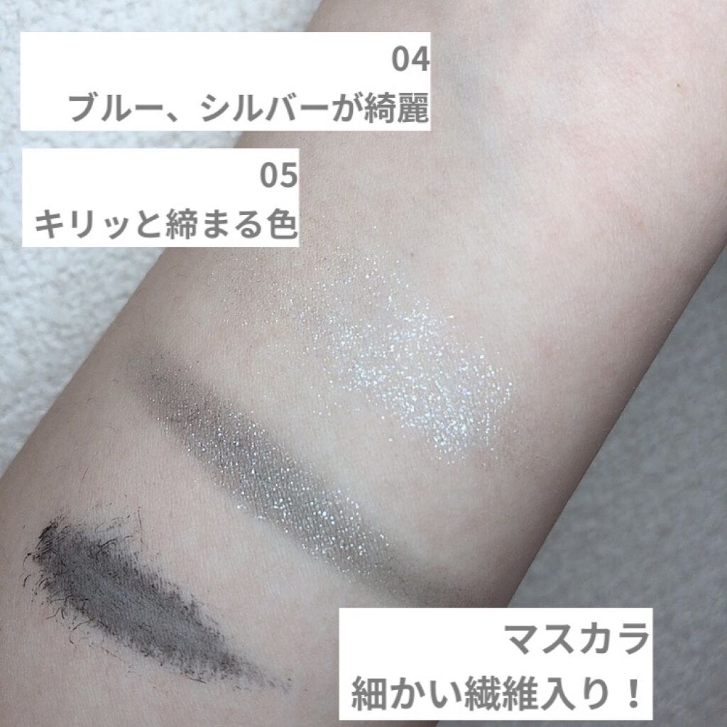 ベースのマットなブラウンは柔らかい発色で、色の調節がしやすいです! 濃くしたい人はとことん濃くつけれる気がします🙆♀️ 少しメタリックなレッドのカラーは、しっかり色を出せるので目尻の際に濃いめに入れるのが私のお気に入りです🐰 ラメはシルバー強めのしっかりキラキララメです🌟 最後にひと塗りするだけで雰囲気が変わるのでとても好きです♡ ハイライトはバームタイプで、アイシャドウベースとして仕込むのもありかなと思っています! 上から艶を乗せるという発想が新しくてつい使っちゃいます🥰