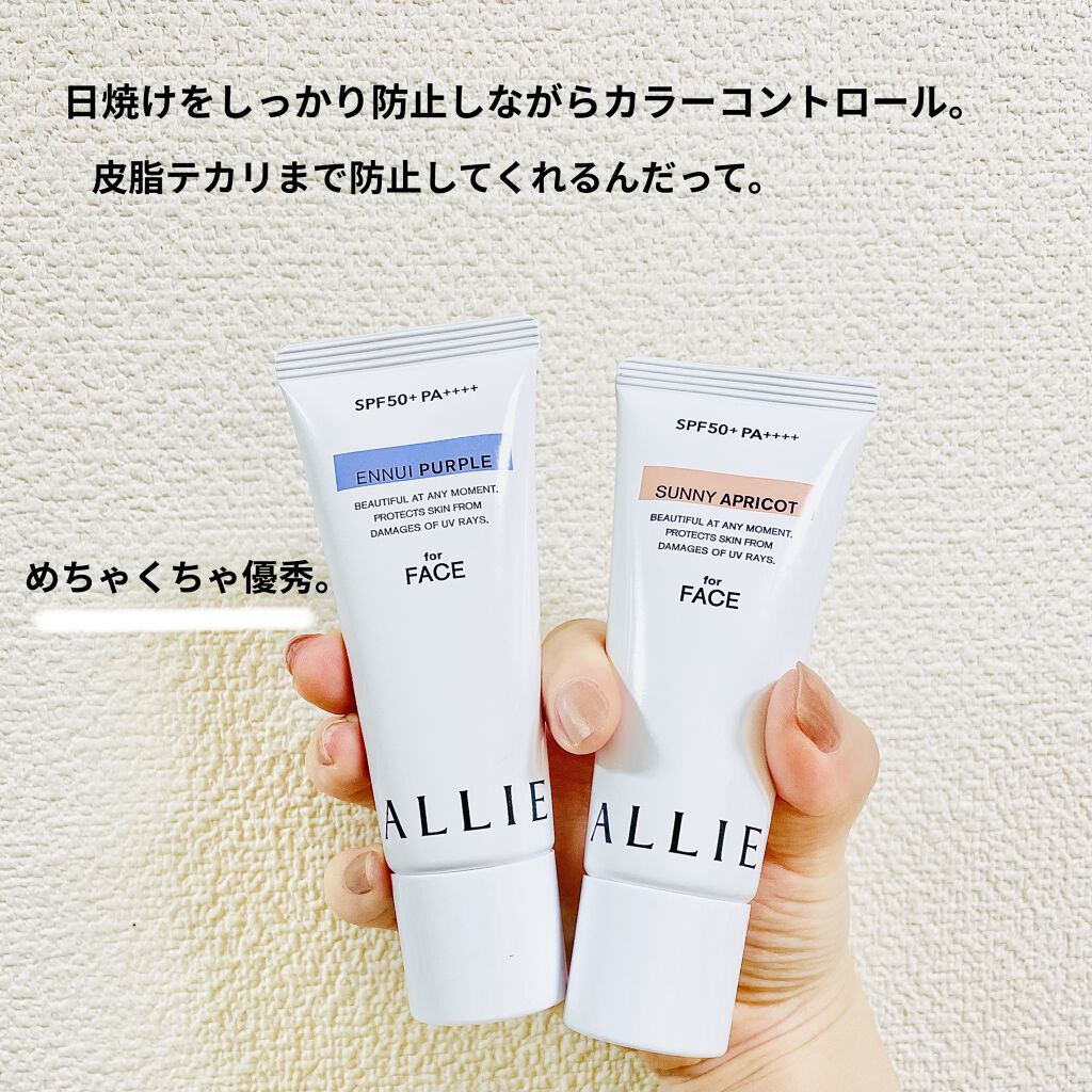 - 世界を想う 美しさつづく*1 日やけ止め おでかけも、マスクを外す機会も増える毎日に。 一部の国・地域・ビーチの規制に配慮した設計のビーチフレンドリー処方。 これ 1 本で、UV カット&顔色補整効果でクマ・くすみ・色ムラまでカバー! テカりにくく、くずれにくいノーファンデ UV*2 【ENNUI PURPLE】 くすみや毛穴をカバー 儚げな透明感のある顔印象続く 澄んだ気分を誘う 紫陽花しずく&セージの香り 【SUNNY APRICOT】 クマや毛穴をカバー いきいきとした血色感のある顔印象つづく 思わず出かけたくなる アプリコット&金木犀の香り 【SHERR BEIGE】 色ムラや毛穴をカバー 均一で抜け感のある顔印象つづく 自然で飾らない シトラスウッディ&パチュリの香り ●一部の国・地域・ビーチの規制に配慮した設計の「ビーチフレンドリー処方」 ●SPF50+・PA++++ ●汗・水 こすれに強く落ちにくい フリクションプルーフ・スーパーウォータープルーフ ●ベタつきにくい感触がつづく ●テカりにくくキレイな肌仕上がりがつづく ●環境に配慮した素材を使用したパッケージ採用 ●美容液成分(保湿)ヒアルロン酸Na配合 ●顔用 ●普段のメイククレンジングで落とせる ●マスク・タオル等につきにくい ●化粧下地効果 *1 スキンケア効果またはメイクアップ効果による肌仕上がりのこと *2 ファンデーション未使用時でも、自然なベースメイクが仕上がる日やけ止めのこと *3 チリ・ほこり・PM2.5・花粉等すべての微粒子汚れの付着を防ぐわけではありません 01:ENNUI PURPLE パープル 02:SUNNY APRICOT アプリコットピンク 03:SHEER BEIGE ミルキーベージュ