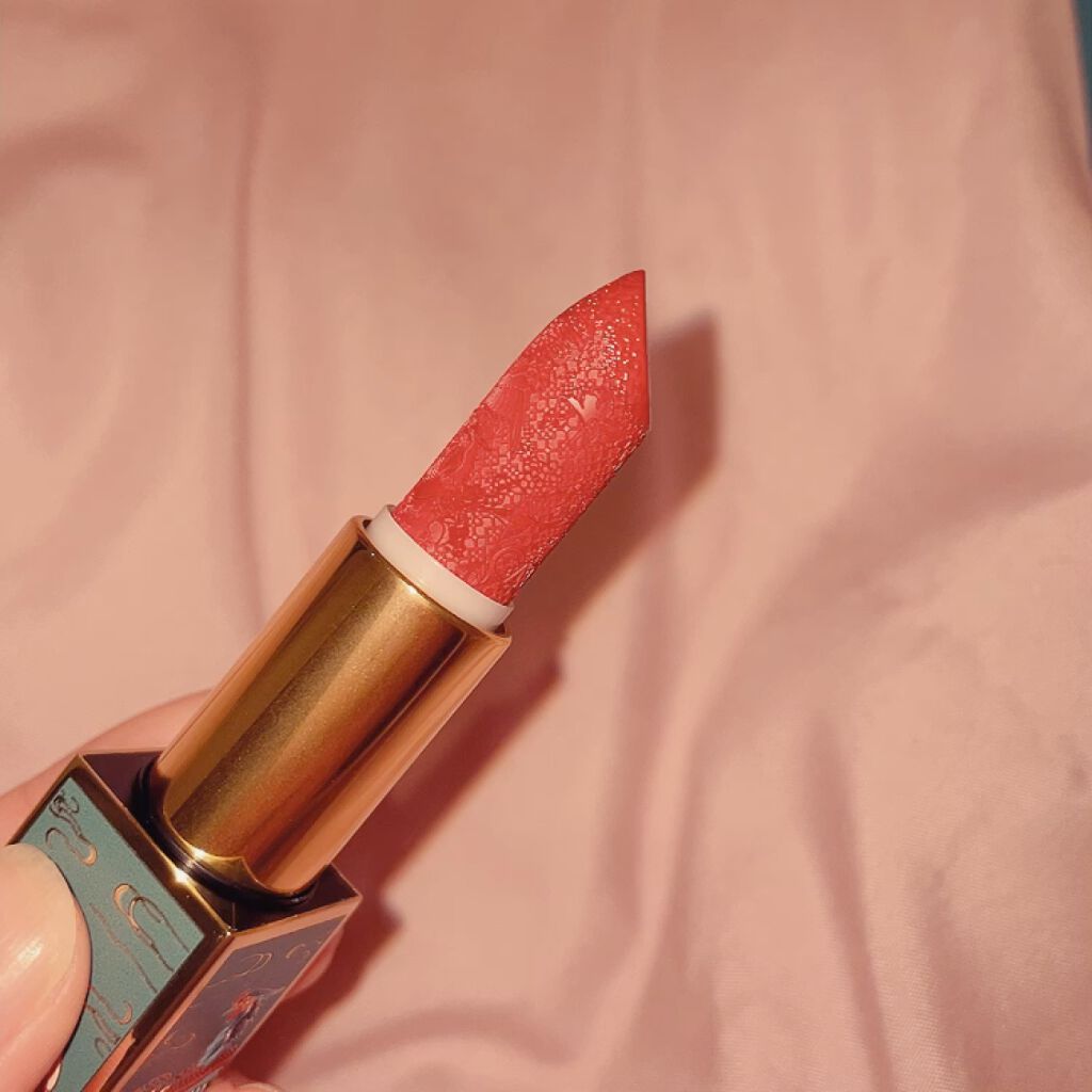 こちらはもう生産終了品です💦 この口紅してるときかなりの頻度で「それどこの?」て聞かれます🥰 ぼかしてのせるとふんわりとしたローズピンクになってすごくきれいな発色になります✨ この口紅の良いところはビジュアル良すぎなところ💯 口紅本体への立体プリントとか使うのが惜しすぎ…