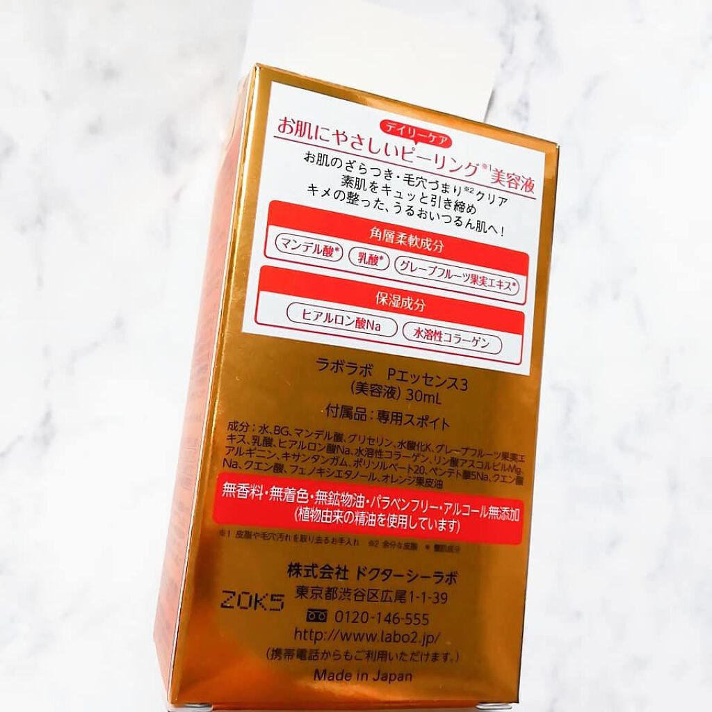 - No.1毛穴ケアブランドラボラボから、肌悩みに合わせて選べる新発想のピーリング美容液が誕生。 クリニックで人気の施術「ミルクピール」を応用し、ホームケアできるように開発しました。角質ケア成分の濃度と、異なる美容液成分の組み合わせで、3タイプからお選びいただけます。 ------------------------------------- ◆スーパー毛穴ピールセラム3(肌悩みレベル★★★) ピールセラム3種共通成分マンデル酸*1に加え、ヒアルロン酸*2・水溶性コラーゲン*3配合で、保湿ケア、毛穴の詰まり、肌のざらつきまで、これ一本でアプローチ。お肌をキュッと引き締め、化粧ノリが良い、キメの整ったうるおいつるん肌へ。 ◆スーパー毛穴ピールセラム5(肌悩みレベル★★★★★) ピールセラム3種共通成分マンデル酸*1に加え、セラミド*4、肌あれ予防成分*5配合で、保湿ケア、毛穴の詰まり、角栓、肌あれ、キメの乱れまで、これ一本でアプローチ。お肌の土台を整え、キメの整ったさらすべ肌へ。 ◆スーパー毛穴ピールセラム10(肌悩みレベル★★★★★★★) ピールセラム3種共通成分マンデル酸*1に加え、ナイアシンアミド*1配合で、保湿ケア、毛穴の詰まり・黒ずみ、角栓、肌あれ、キメの乱れ、疲れ肌、べたつき、ざらつき、凹凸、くすみまで、これ一本でアプローチ。週2・3度のスペシャルケアで、凹凸のないなめらかな肌へ。 ------------------------------------- 化粧水の後に塗るだけ!洗い流し不要で簡単ケアが可能に。 敏感肌の方も安心のやさしい使い心地で、毎日お使いいただけます。 スッと浸透するテクスチャーで、保湿~毛穴ケアまでマルチな効果を発揮します。さらに、安心してお使いいただける5フリー処方で、朝晩ご使用可能です。 無香料・無着色・無鉱物油・パラベンフリー・アルコール無添加 ※植物由来の精油を使用しています ※アレルギーテスト済み(すべての方にアレルギーが起きないというわけではありません) No.1毛穴ケアブランド=出典:富士経済「機能性化粧品マーケティング要覧2019-2020」スキンケア市場皮脂・毛穴ケアカテゴリーにおける2018年の実績 ピーリング=皮脂や毛穴汚れを取り去るお手入れ 黒ずみ=毛穴汚れのこと 疲れ肌=くすんで見える肌状態のこと くすみ=古い角質によりくすんで見えること 浸透=角層まで *1 整肌成分 *2 ヒアルロン酸Na(保湿成分) *3 保湿成分 *4 セラミドNG(保湿成分) *5 ツボクサ葉エキス(整肌成分)