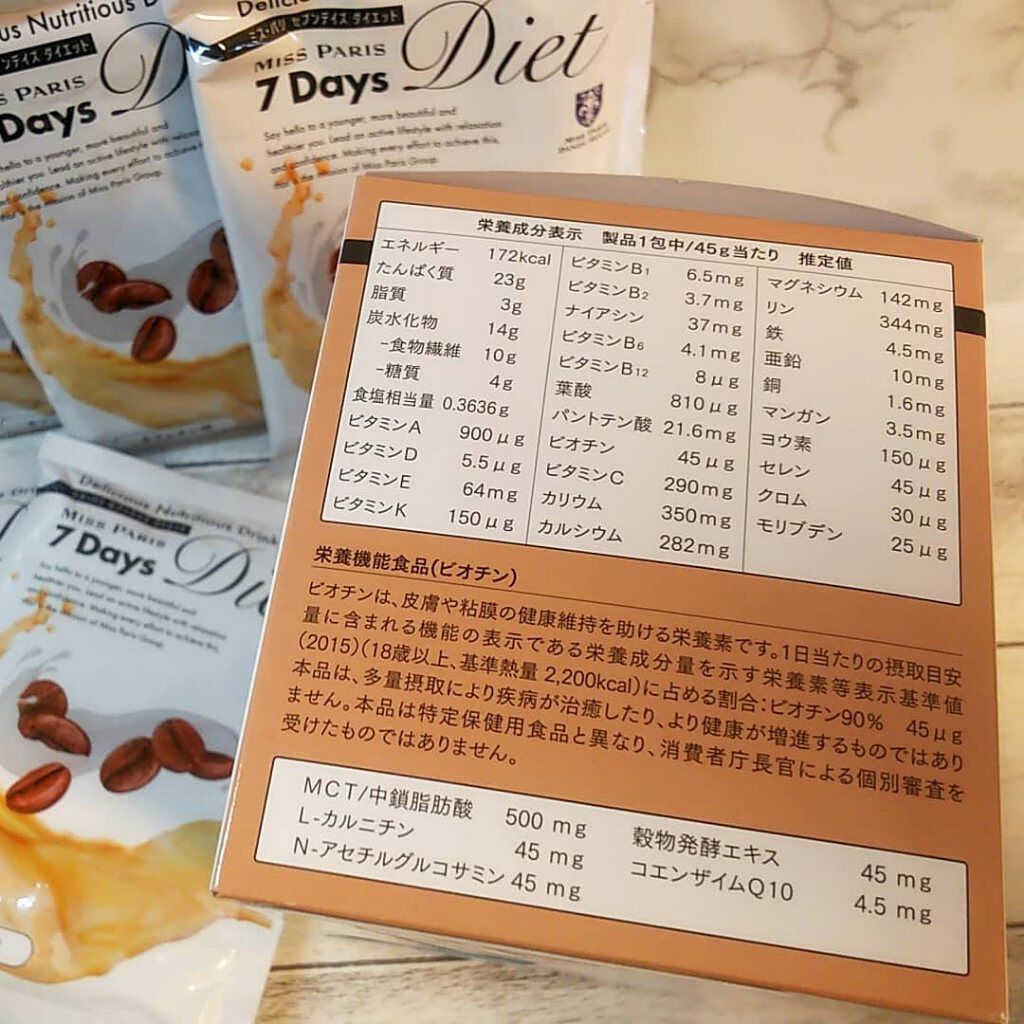 \ミス・パリ 7daysDiet♡/体重に変化がみえなくなってきたので、7日間の1食置き換えダイエットにチャレンジしてみようと思い購入してみました✨朝ごはんいつもヨーグルト+フルーツなのですが、栄養たっぷりのミス・パリ7daysDietに置き...