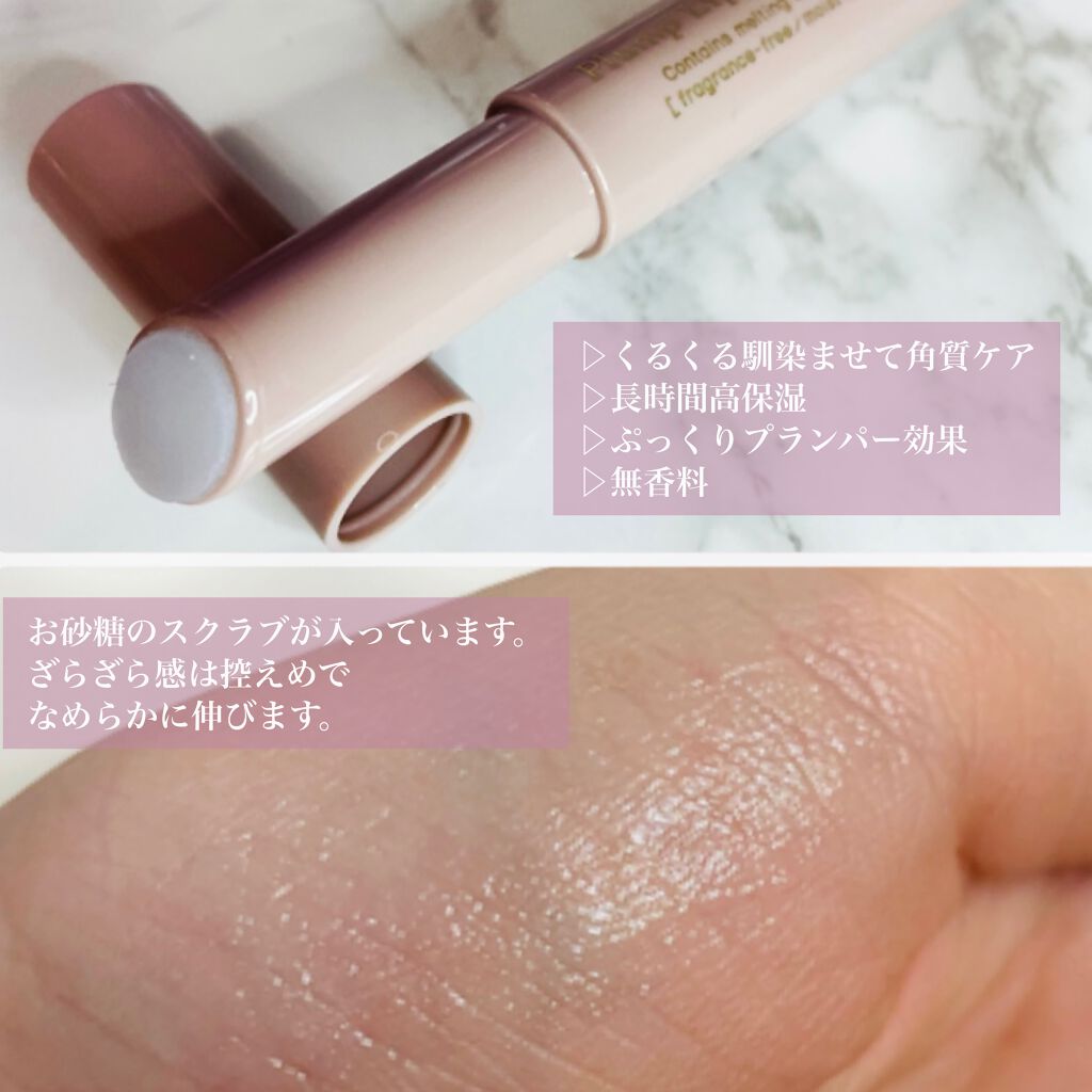 - 塗るだけで手軽に「柔らか唇エステ」 潤い&角質ケアができるリップスクラブ。 唇の上で溶けるお砂糖のスクラブが古い角質を優しくオフして、なめらかな唇に整えます。 リップパックした後のような高保湿が持続します。 拭き取り・洗い流し不要なので、外出先でも手軽にケアできます。 清涼感のある使い心地 ・スクラブ目的として砂糖の粒子を配合しておりますが、唇の状態によって刺激に感じられる可能性がございますのでご注意ください。 ・強くこすると刺激を感じることがあります。こすりすぎないように注意してください。 ・大変柔らかいバームですので、1㎜程度繰り出してお使いください。 ・一度繰り出したバームは戻りませんのでご注意ください。