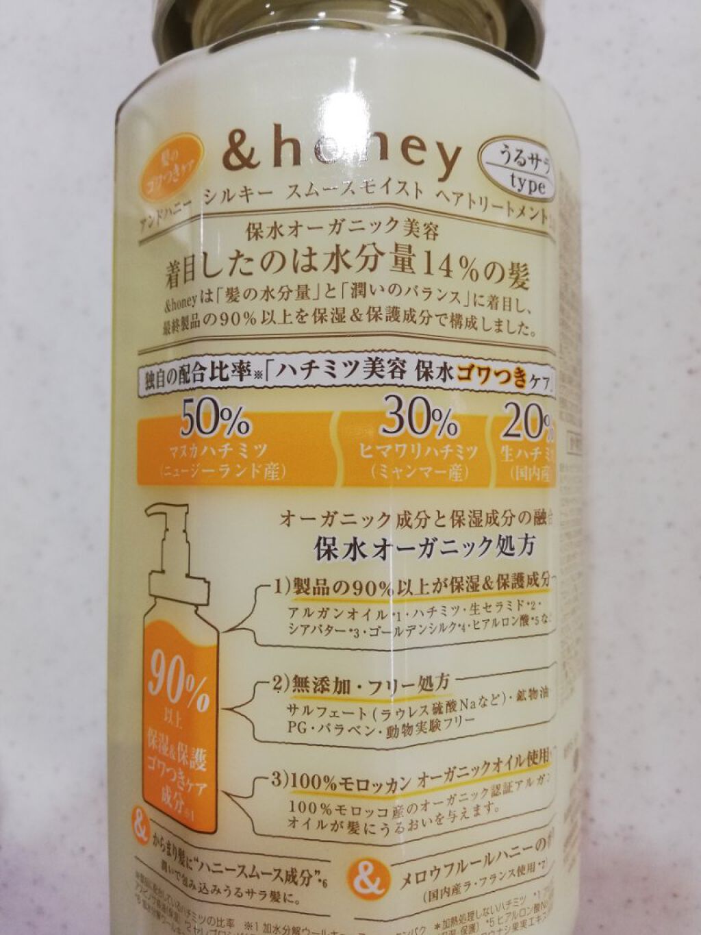 - <ヘアトリートメント(詰替)385g> 水、ラウラミドプロピルベタイン、ラウロイルメチルアラニンNa、コカミドプロピルベタイン、オレフィン(C14-16)スルホン酸Na、グリセリン、コカミドDEA、ハチミツ、加水分解ハチミツタンパク、アルガニアスピノサ核油、シア脂グリセレス-8エステルズ、加水分解シルク、イソステアロイル加水分解シルク、加水分解ウールキューティクルタンパク、γ-ドコサラクトン、ヒアルロン酸Na、セレブロシド、シア脂、パンテノール、ケラチン(羊毛)、ゼイン、ベルガモット果実油、ミリスチルベタイン、ココイルグルタミン酸TEA、ポリクオタニウム-47、PPG-7、EDTA-2Na、ポリクオタニウム-10、塩化Na、キサンタンガム、イソステアリン酸、セバシン酸ジエチル、メントール、水酸化K、黄5、ジエチルアミノヒドロキシベンゾイル安息香酸ヘキシル、メトキシケイヒ酸エチルヘキシル、ペンチレングリコール、安息香酸Na、クエン酸、黄4、DPG、BG、フェノキシエタノール、香料、セテアリルアルコール、ベヘントリモニウムクロリド、ジメチコン、トリエチルヘキサノイン、ソルビトール、セイヨウナシ果実エキス、ヒドロキシエチルセルロース、ペンテト酸5Na、クエン酸Na、アミノプロピルジメチコン <シャンプー本体440ml> 水、ラウラミドプロピルベタイン、ラウロイルメチルアラニンNa、コカミドプロピルベタイン、オレフィン(C14-16)スルホン酸Na、グリセリン、コカミドDEA、ハチミツ、加水分解ハチミツタンパク、アルガニアスピノサ核油、シア脂グリセレス-8エステルズ、加水分解シルク、イソステアロイル加水分解シルク、加水分解ウールキューティクルタンパク、γ-ドコサラクトン、ヒアルロン酸Na、セレブロシド、シア脂、パンテノール、ケラチン(羊毛)、ゼイン、ベルガモット果実油、ミリスチルベタイン、ココイルグルタミン酸TEA、ポリクオタニウム-47、PPG-7、EDTA-2Na、ポリクオタニウム-10、塩化Na、キサンタンガム、イソステアリン酸、セバシン酸ジエチル、メントール、水酸化K、黄5、ジエチルアミノヒドロキシベンゾイル安息香酸ヘキシル、メトキシケイヒ酸エチルヘキシル、ペンチレングリコール、安息香酸Na、クエン酸、黄4、DPG、BG、フェノキシエタノール、香料 <ヘアトリートメント本体445g> 水、セテアリルアルコール、ベヘントリモニウムクロリド、グリセリン、ジメチコン、トリエチルヘキサノイン、ソルビトール、ハチミツ、加水分解ハチミツタンパク、アルガニアスピノサ核油、加水分解シルク、イソステアロイル加水分解シルク、加水分解ウールキューティクルタンパク、γ-ドコサラクトン、ヒアルロン酸Na、セレブロシド、シア脂、パンテノール、ケラチン(羊毛)、ゼイン、セイヨウナシ果実エキス、キサンタンガム、ヒドロキシエチルセルロース、ペンテト酸5Na、クエン酸、クエン酸Na、セバシン酸ジエチル、黄4、イソステアリン酸、アミノプロピルジメチコン、DPG、BG、フェノキシエタノール、香料 <シャンプー(詰替)350ml> 水、ラウラミドプロピルベタイン、ラウロイルメチルアラニンNa、コカミドプロピルベタイン、オレフィン(C14-16)スルホン酸Na、グリセリン、コカミドDEA、ハチミツ、加水分解ハチミツタンパク、アルガニアスピノサ核油、シア脂グリセレス-8エステルズ、加水分解シルク、イソステアロイル加水分解シルク、加水分解ウールキューティクルタンパク、γ-ドコサラクトン、ヒアルロン酸Na、セレブロシド、シア脂、パンテノール、ケラチン(羊毛)、ゼイン、ベルガモット果実油、ミリスチルベタイン、ココイルグルタミン酸TEA、ポリクオタニウム-47、PPG-7、EDTA-2Na、ポリクオタニウム-10、塩化Na、キサンタンガム、イソステアリン酸、セバシン酸ジエチル、メントール、水酸化K、黄5、ジエチルアミノヒドロキシベンゾイル安息香酸ヘキシル、メトキシケイヒ酸エチルヘキシル、ペンチレングリコール、安息香酸Na、クエン酸、黄4、DPG、BG、フェノキシエタノール、香料 <ヘアトリートメント(詰替)350g> 水、セテアリルアルコール、ベヘントリモニウムクロリド、グリセリン、ジメチコン、トリエチルヘキサノイン、ソルビトール、ハチミツ、加水分解ハチミツタンパク、アルガニアスピノサ核油、加水分解シルク、イソステアロイル加水分解シルク、加水分解ウールキューティクルタンパク、γ-ドコサラクトン、ヒアルロン酸Na、セレブロシド、シア脂、パンテノール、ケラチン(羊毛)、ゼイン、セイヨウナシ果実エキス、キサンタンガム、ヒドロキシエチルセルロース、ペンテト酸5Na、クエン酸、クエン酸Na、セバシン酸ジエチル、黄4、イソステアリン酸、アミノプロピルジメチコン、DPG、BG、フェノキシエタノール、香料 <お試し(シャンプー10ml+トリートメント10g)> 水、ラウラミドプロピルベタイン、ラウロイルメチルアラニンNa、コカミドプロピルベタイン、オレフィン(C14-16)スルホン酸Na、グリセリン、コカミドDEA、ハチミツ、加水分解ハチミツタンパク、アルガニアス