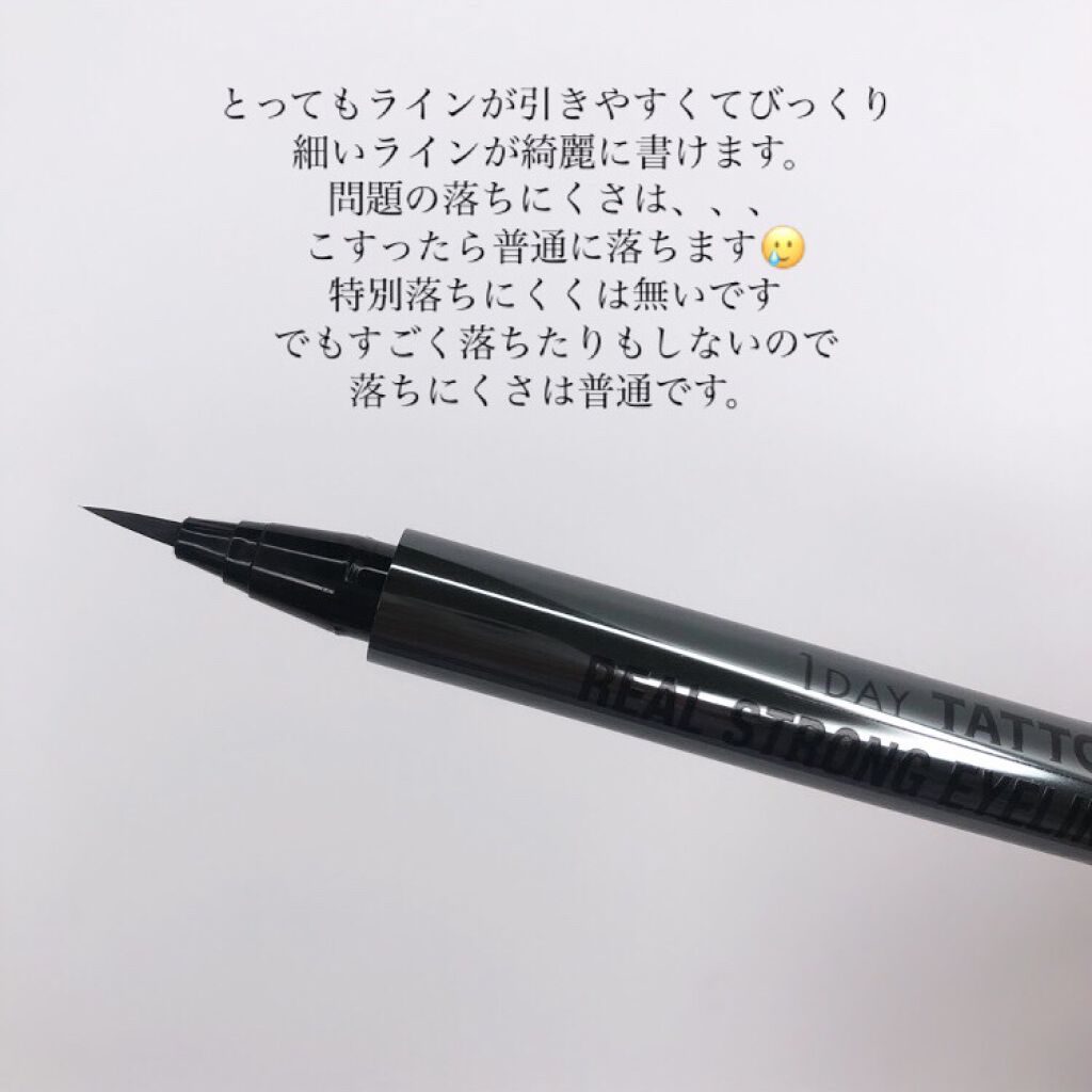 - 1DAY TATTOOシリーズから超耐久のアイライナーが新登場 ・3種のキープ剤をミックスした超耐久成分を高配合し耐久性抜群のアイライナーです。 ・程よくコシのある筆で大胆なラインも繊細なラインも思いのまま。 ・発色抜群で色ムラやかすれがなく、ひと描きで印象的な目元に。 ・7種の配合保湿成分で仕上がりだけでなく肌やまつげへの優しさもこだわった処方です。 ・目元をはっきりと際立たせるツヤと深みのあるブラックカラーです。