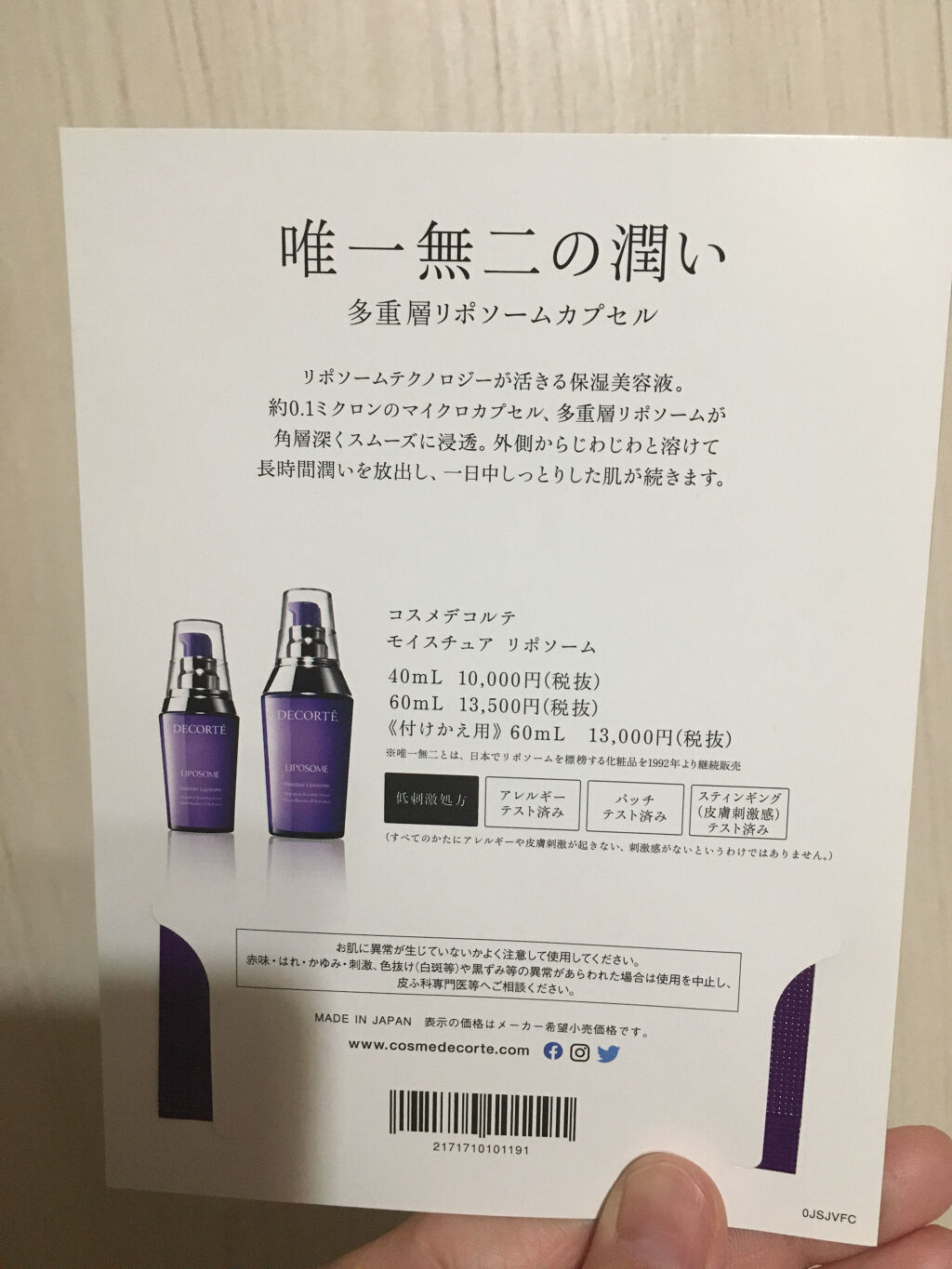 - 多重層リポソームを採用した化粧品として、“モイスチュアリポソーム”の愛称とともに、長年親しまれているコスメデコルテの保湿美容液です。 洗顔後すぐ肌になじませると、直径0.1ミクロンのリン脂質のカプセルが角層深くまでスムーズに浸透。 外側の膜から少しずつ美容成分を放出するので、かさつく肌はいつまでもしっとり。 キメをふっくら整え、ハリのあるなめらかな肌をかなえます。