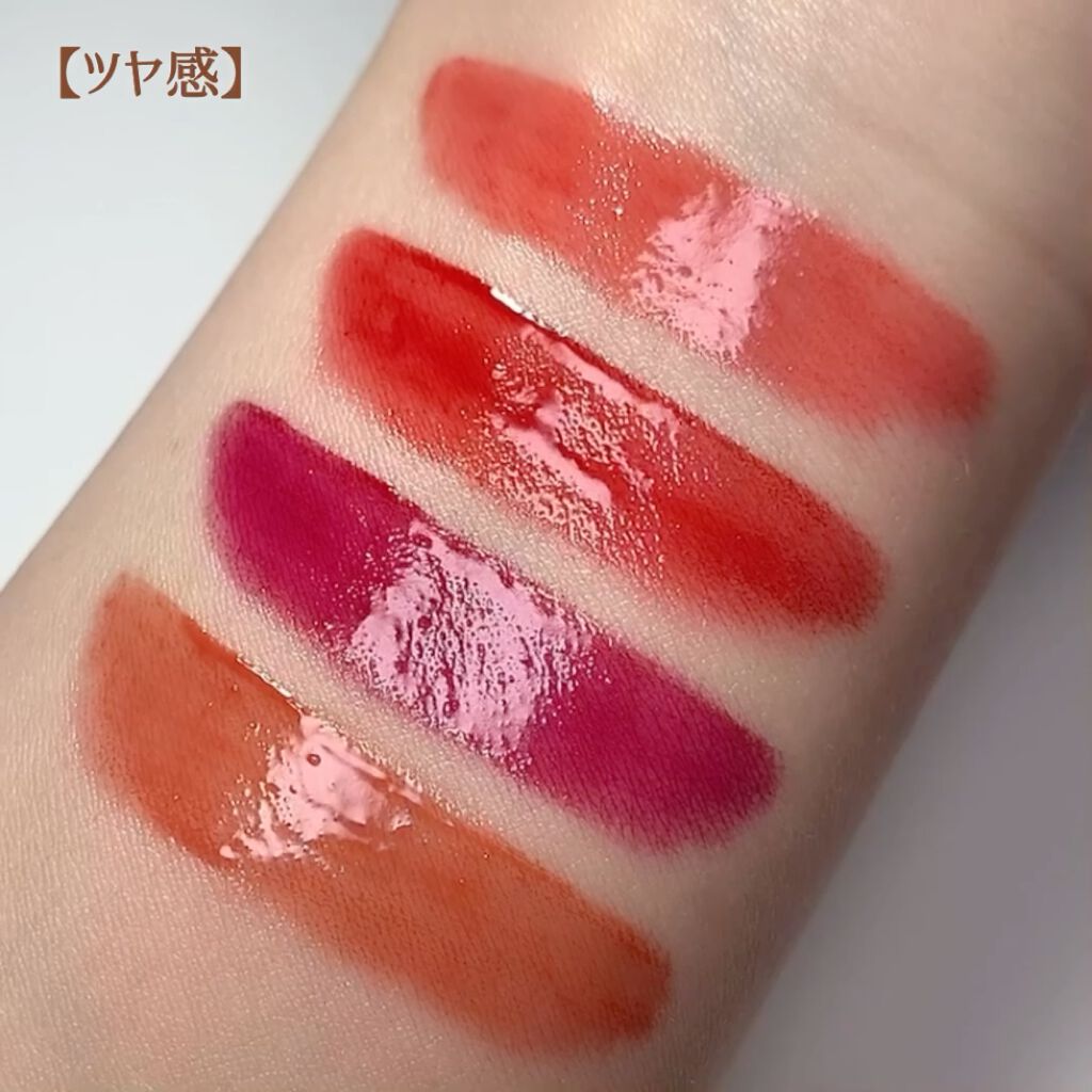 - <01 #Cheeky Peach> 水、ジフェニルジメチコン、ビスジグリセリルポリアシルアジペート-2、リンゴ酸ジイソステアリル、オクチルドデカノール、水添ポリイソブテン、グリセリン、ダイマージリノール酸ダイマージリノレイルビス(ベヘニル/イソステアリル/フィトステリル)、セチルPEG/PPG-10/1ジメチコン、DPG、イソステアリン酸ソルビタン、ポリソルベート60、ペンチレングリコール、ホホバ種子油、フェノキシエタノール、ヒアルロン酸Na、酸化チタン、ハチミツエキス、BG、スクワラン、(アクリル酸ヒドロキシエチル/アクリロイルジメチルタウリンNa)コポリマー、エチルヘキシルグリセリン、黄5、青1、黄4、赤104(1)、セテアレス-20、赤227、香料 <02 #Berry Kitsch> 水、ジフェニルジメチコン、ビスジグリセリルポリアシルアジペート-2、リンゴ酸ジイソステアリル、オクチルドデカノール、水添ポリイソブテン、ダイマージリノール酸ダイマージリノレイルビス(ベヘニル/イソステアリル/フィトステリル)、グリセリン、セチルPEG/PPG-10/1ジメチコン、DPG、イソステアリン酸ソルビタン、ポリソルベート60、ペンチレングリコール、ホホバ種子油、フェノキシエタノール、ヒアルロン酸Na、ハチミツエキス、BG、スクワラン、(アクリル酸ヒドロキシエチル/アクリロイルジメチルタウリンNa)コポリマー、エチルヘキシルグリセリン、黄5、青1、赤104(1)、セテアレス-20、赤227、香料 <03 #Kill Me Plum> 水、ジフェニルジメチコン、ビスジグリセリルポリアシルアジペート-2、リンゴ酸ジイソステアリル、オクチルドデカノール、水添ポリイソブテン、ダイマージリノール酸ダイマージリノレイルビス(ベヘニル/イソステアリル/フィトステリル)、グリセリン、セチルPEG/PPG-10/1ジメチコン、DPG、イソステアリン酸ソルビタン、ポリソルベート60、ペンチレングリコール、ホホバ種子油、フェノキシエタノール、ヒアルロン酸Na、ハチミツエキス、BG、スクワラン、(アクリル酸ヒドロキシエチル/アクリロイルジメチルタウリンNa)コポリマー、エチルヘキシルグリセリン、黄5、青1、黄4、セテアレス-20、赤227、香料 <04 #Lively Nude> 水、ジフェニルジメチコン、ビスジグリセリルポリアシルアジペート-2、リンゴ酸ジイソステアリル、オクチルドデカノール、水添ポリイソブテン、ダイマージリノール酸ダイマージリノレイルビス(ベヘニル/イソステアリル/フィトステリル)、グリセリン、セチルPEG/PPG-10/1ジメチコン、DPG、イソステアリン酸ソルビタン、ポリソルベート60、ペンチレングリコール、ホホバ種子油、フェノキシエタノール、ヒアルロン酸Na、酸化チタン、ハチミツエキス、BG、スクワラン、(アクリル酸ヒドロキシエチル/アクリロイルジメチルタウリンNa)コポリマー、エチルヘキシルグリセリン、黄5、青1、黄4、赤104(1)、セテアレス-20、赤227、香料