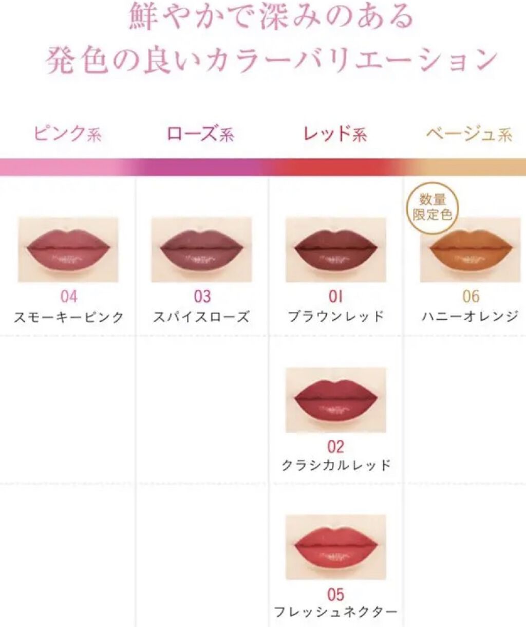 - <01> リンゴ酸ジイソステアリル、テトライソステアリン酸ジペンタエリスリチル、イソノナン酸イソトリ デシル、オクチルドデカノール、水添ポリイソブテン、ジカプリン酸ネオペンチルグリコール、ヘキサヒド ロキシステアリン酸ジペンタエリスリチル、ビスアルキル(C16-18)グリセリルウンデシルジメチコン、パ ラフィン、(ベヘン酸/ポリヒドロキシステアリン酸)ペンタエリスリチル、合成ワックス、マイクロクリスタ リンワックス、セレシン、メトキシケイヒ酸エチルヘキシル、PEG-12ジメチコン、ラウロイルグルタミン酸 ジ(オクチルドデシル/フィトステリル/ベヘニル)、パルミトイルヒドロキシプロピルセルロース、ジステ アルジモニウムヘクトライト、スクワラン、炭酸プロピレン、酢酸トコフェロール、BHT、グリチルレチン酸 ステアリル、シメチコン、カミツレ花エキス、(+/-)セルロース、パルミチン酸、マイカ、ラウロイルアスパ ラギン酸Na、塩化亜鉛、酸化チタン、酸化鉄、水酸化Al、硫酸Ba、トリイソステアリン酸イソプロピル チタン、トリエトキシカプリリルシラン、合成フルオロフロゴパイト、黄4、青1、赤104(1)、赤201、赤202 <02> テトライソステアリン酸ジペンタエリスリチル、イソノナン酸イソトリデシル、オクチルドデカノール、リン ゴ酸ジイソステアリル、水添ポリイソブテン、ジカプリン酸ネオペンチルグリコール、ヘキサヒドロキシステア リン酸ジペンタエリスリチル、ビスアルキル(C16-18)グリセリルウンデシルジメチコン、パラフィン、(ベヘ ン酸/ポリヒドロキシステアリン酸)ペンタエリスリチル、合成ワックス、ラウロイルグルタミン酸ジ(オクチ ルドデシル/フィトステリル/ベヘニル)、マイクロクリスタリンワックス、セレシン、メトキシケイヒ酸エチル ヘキシル、PEG-12ジメチコン、パルミトイルヒドロキシプロピルセルロース、ジステアルジモニウムヘクトラ イト、ヒドロキシステアリン酸エチルヘキシル、スクワラン、炭酸プロピレン、酢酸トコフェロール、BHT、グリチ ルレチン酸ステアリル、シメチコン、カミツレ花エキス、(+/-)セルロース、パルミチン酸、マイカ、ラウロ イルアスパラギン酸Na、塩化亜鉛、酸化チタン、酸化鉄、水酸化Al、硫酸Ba、トリイソステアリン酸イソプ ロピルチタン、トリエトキシカプリリルシラン、合成フルオロフロゴパイト、黄4、黄5、赤104(1)、赤201、赤202 <03> リンゴ酸ジイソステアリル、テトライソステアリン酸ジペンタエリスリチル、イソノナン酸イソトリ デシル、オクチルドデカノール、水添ポリイソブテン、ジカプリン酸ネオペンチルグリコール、ヘキサヒド ロキシステアリン酸ジペンタエリスリチル、ビスアルキル(C16-18)グリセリルウンデシルジメチコン、パ ラフィン、(ベヘン酸/ポリヒドロキシステアリン酸)ペンタエリスリチル、合成ワックス、マイクロクリスタ リンワックス、セレシン、メトキシケイヒ酸エチルヘキシル、PEG-12ジメチコン、ラウロイルグルタミン酸 ジ(オクチルドデシル/フィトステリル/ベヘニル)、パルミトイルヒドロキシプロピルセルロース、ジステ アルジモニウムヘクトライト、スクワラン、炭酸プロピレン、酢酸トコフェロール、BHT、グリチルレチン酸 ステアリル、シメチコン、カミツレ花エキス、(+/-)セルロース、パルミチン酸、マイカ、ラウロイルアスパ ラギン酸Na、塩化亜鉛、酸化チタン、酸化鉄、水酸化Al、硫酸Ba、トリイソステアリン酸イソプロピル チタン、トリエトキシカプリリルシラン、合成フルオロフロゴパイト、黄4、青1、赤104(1)、赤201、赤202 <05> リンゴ酸ジイソステアリル、テトライソステアリン酸ジペンタエリスリチル、イソノナン酸イソトリ デシル、オクチルドデカノール、水添ポリイソブテン、ジカプリン酸ネオペンチルグリコール、ヘキサヒド ロキシステアリン酸ジペンタエリスリチル、ビスアルキル(C16-18)グリセリルウンデシルジメチコン、パ ラフィン、(ベヘン酸/ポリヒドロキシステアリン酸)ペンタエリスリチル、合成ワックス、マイクロクリスタ リンワックス、セレシン、メトキシケイヒ酸エチルヘキシル、PEG-12ジメチコン、ラウロイルグルタミン酸 ジ(オクチルドデシル/フィトステリル/ベヘニル)、パルミトイルヒドロキシプロピルセルロース、ジステ アルジモニウムヘクトライト、スクワラン、炭酸プロピレン、酢酸トコフェロール、BHT、グリチルレチン酸 ステアリル、シメチコン、カミツレ花エキス、(+/-)セルロース、パルミチン酸、マイカ、ラウロイルアスパ ラギン酸Na、塩化亜鉛、酸化チタン、酸化鉄、水酸化Al、硫酸Ba、トリイソステアリン酸イソプロピル チタン、トリエトキシカプリリルシラン、合成フルオロフロゴパイト、黄4、青1、赤104(1)、赤201、赤202 <07 ラズベリーチョコレート> テトライソステアリン酸ジペンタエリスリチル、イソノナン酸イソトリデシル、オクチルドデカノール、水添ポリイソブテン、ジカプリン酸ネオペンチルグリコール、リンゴ酸ジイソ