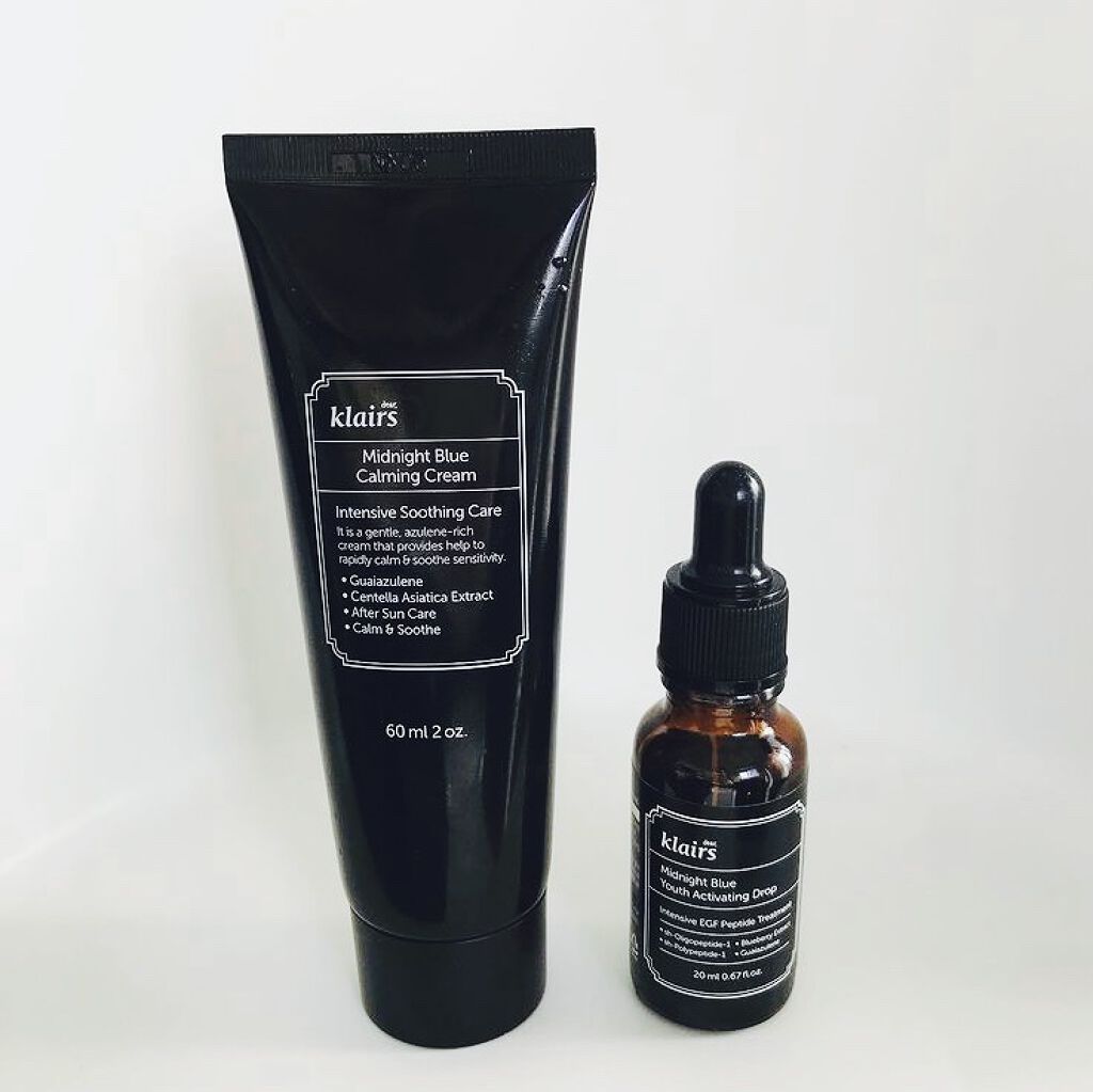 青い美容液&クリーム!!Klairsミッドナイトブルーユースアクティベーティングドロップ🌸ミッドナイトブルーカーミングクリーム青いのは着色料ではなく、植物成分の天然原料グアイアズレンが含まれているから💡グアイアズレンとは、炎症を抑える医薬品に...