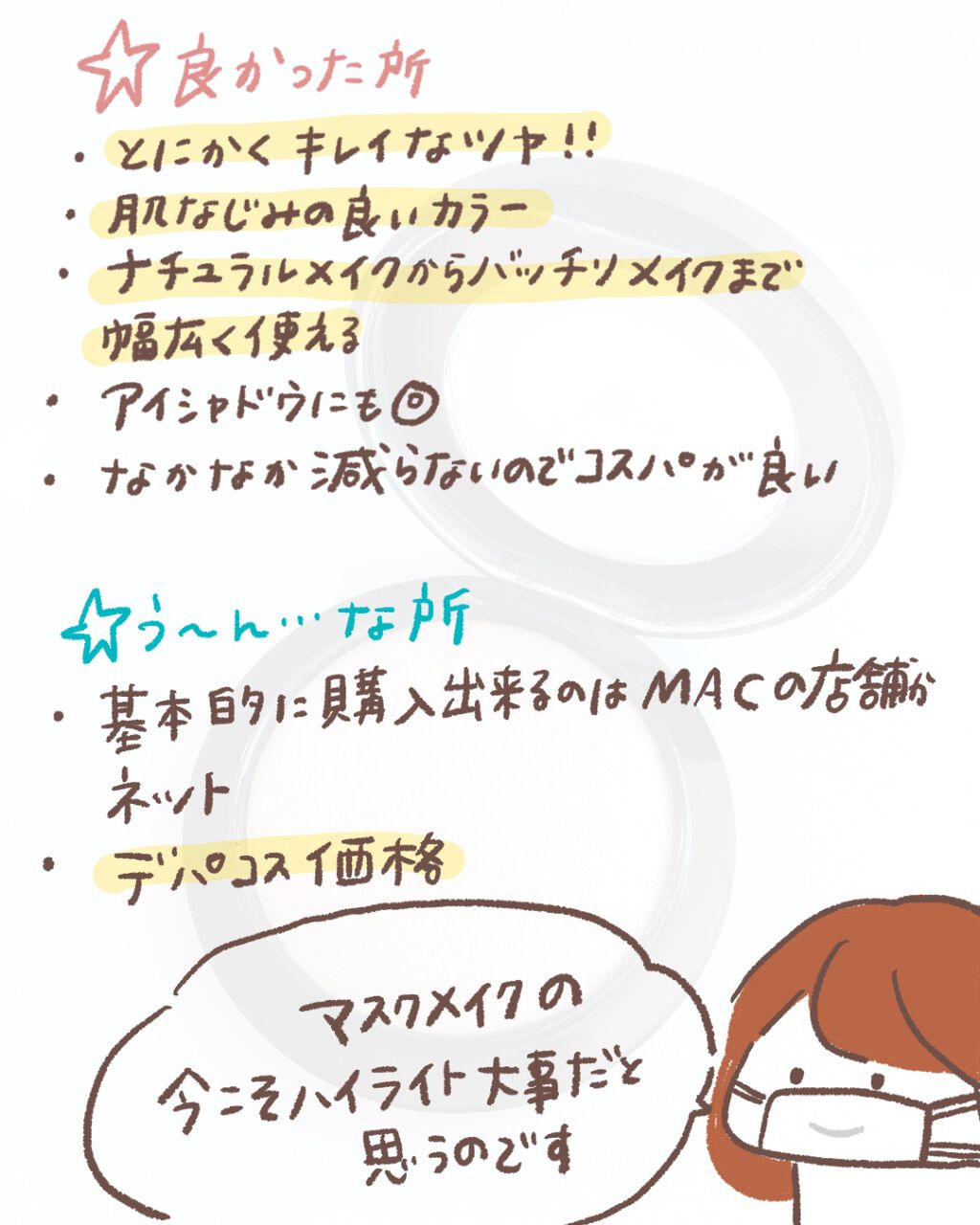 M・A・Cといえば!!の有名ハイライト。 ツヤツヤ、ギラギラという感じではなく自然で品がある艶感です! 細かいキラキラが、とても可愛い♡ ブラシでサッと塗るととても綺麗に塗れます。 コスパはほんとーに良いと思います♡ ただ付属のブラシはないので、持ち運びには向いていないかなあ、、、⚠️⚠️⚠️