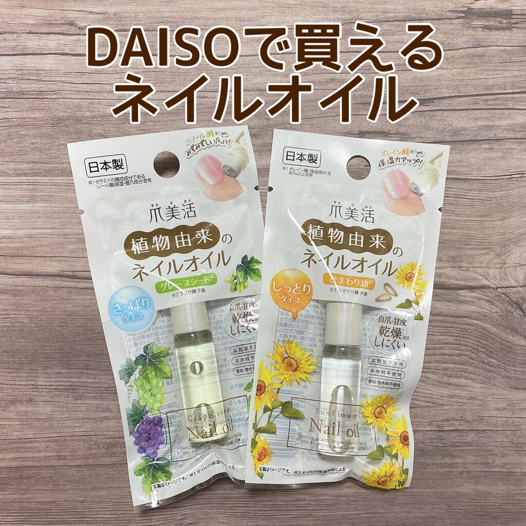 DAISOで見かけて購入をしてからリピートをしています。110円でした。ボールペンみたいな先がついたボトルの設計が素敵ですね。出しすぎもなく、手の爪、足の爪を切った後は私は必ずやすりで形を整えたり2枚爪の対策をしてからネイルオイルなどをつける...