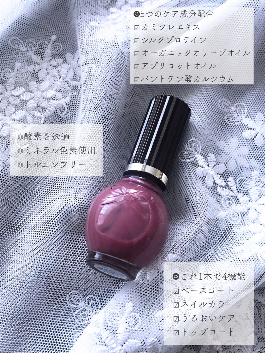 - <01 ほんのりピンク> 酢酸ブチル、酢酸エチル、ニトロセルロース、イソプロパノール、クエン酸アセチルトリブチル、(トシルアミド/エポキシ)樹脂、カンフル、ステアラルコニウムヘクトライト、ジアセトンアルコール、アンズ核油、オリーブ果実油、加水分解シルクエチル、パントテン酸Ca、カミツレ花エキス、エタノール、ヒマシ油脂肪酸(グリセリン/イソフタル酸)コポリマー、オキシベンゾン-3、ブタノール、リンゴ酸、安息香酸スクロース、アクリレーツコポリマー、クエン酸、シリカ、ミリスチン酸オクチルドデシル、アルミナ、メチコン、BG、水、パーフルオロオクチルトリエトキシシラン、酸化チタン、マンガンバイオレット、酸化鉄 <02 ほんのりコーラル> 酢酸ブチル、酢酸エチル、ニトロセルロース、イソプロパノール、クエン酸アセチルトリブチル、(トシルアミド/エポキシ)樹脂、カンフル、ステアラルコニウムヘクトライト、ジアセトンアルコール、アンズ核油、オリーブ果実油、加水分解シルクエチル、パントテン酸Ca、カミツレ花エキス、エタノール、ヒマシ油脂肪酸(グリセリン/イソフタル酸)コポリマー、ブタノール、オキシベンゾン-3、安息香酸スクロース、リンゴ酸、アクリレーツコポリマー、クエン酸、シリカ、ミリスチン酸オクチルドデシル、アルミナ、メチコン、BG、水、パーフルオロオクチルトリエトキシシラン、酸化チタン、酸化鉄、マンガンバイオレット <04 大人ピンクベージュ> 酢酸ブチル、酢酸エチル、ニトロセルロース、イソプロパノール、クエン酸アセチルトリブチル、(トシルアミド/エポキシ)樹脂、カンフル、ステアラルコニウムヘクトライト、ジアセトンアルコール、アンズ核油、オリーブ果実油、加水分解シルクエチル、パントテン酸Ca、カミツレ花エキス、エタノール、ヒマシ油脂肪酸(グリセリン/イソフタル酸)コポリマー、ブタノール、オキシベンゾン-3、安息香酸スクロース、リンゴ酸、アクリレーツコポリマー、クエン酸、ミリスチン酸オクチルドデシル、パーフルオロオクチルトリエトキシシラン、水酸化Al、BG、水、酸化チタン、酸化鉄、カーボンブラック、マンガンバイオレット <30 大人モーヴピンク> 酢酸ブチル 、酢酸エチル、ニトロセルロース、イソプロパノール、クエン酸アセチルトリブチル、(トシルアミド/エポキシ)樹脂、カンフル、ステアラルコニウムヘクトライト、ジアセトンアルコール、アンズ核油 、オリーブ果実油、加水分解シルクエチル、パントテン酸Ca、カミツレ花エキス、エタノール、ヒマシ油脂肪酸(グリセリン/イソフタル酸)コポリマー、ブタノール、安息香酸スクロース、オキシベンゾン-3、アクリレーツコポリマー、リンゴ酸、クエン酸、ミリスチン酸オクチルドデシル、パーフルオロヘキシルエチルトリエトキシシラン、水酸化Al、BG、水、酸化チタン、マンガンバイオレット、酸化鉄、カーボンブラック <31 クリアラベンダー> 酢酸ブチル、酢酸エチル、ニトロセルロース、イソプロパノール、クエン酸アセチルトリブチル、(トシルアミド/エポキシ)樹脂、カンフル、ステアラルコニウムヘクトライト、ジアセトンアルコール、アンズ核油、オリーブ果実油、加水分解シルクエチル、パントテン酸Ca、カミツレ花エキス、エタノール、ヒマシ油脂肪酸(グリセリン/イソフタル酸)コポリマー、ブタノール、オキシベンゾン-3、安息香酸スクロース、アクリレーツコポリマー、リンゴ酸、クエン酸、シリカ、ミリスチン酸オクチルドデシル、パーフルオロヘキシルエチルトリエトキシシラン、水酸化Al、BG、水、グンジョウ、酸化チタン、マンガンバイオレット、酸化鉄 <50 上品ベージュ> 酢酸ブチル、酢酸エチル、ニトロセルロース、イソプロパノール、クエン酸アセチルトリブチル、(トシルアミド/エポキシ)樹脂、カンフル、ステアラルコニウムヘクトライト、ジアセトンアルコール、アンズ核油、オリーブ果実油、加水分解シルクエチル、パントテン酸Ca、カミツレ花エキス、エタノール、ヒマシ油脂肪酸(グリセリン/イソフタル酸)コポリマー、ブタノール、オキシベンゾン-3、安息香酸スクロース、アクリレーツコポリマー、リンゴ酸、クエン酸、パーフルオロヘキシルエチルトリエトキシシラン、ミリスチン酸オクチルドデシル、水酸化Al、BG、水、酸化チタン、酸化鉄、カーボンブラック <51 シアーベージュ> 酢酸ブチル、酢酸エチル、ニトロセルロース、イソプロパノール、クエン酸アセチルトリブチル、(トシルアミド/エポキシ)樹脂、カンフル、ステアラルコニウムヘクトライト、ジアセトンアルコール、アンズ核油、オリーブ果実油、加水分解シルクエチル、パントテン酸Ca、カミツレ花エキス、エタノール、オキシベンゾン-3、リンゴ酸、ヒマシ油脂肪酸(グリセリン/イソフタル酸)コポリマー、ブタノール、安息香酸スクロース、クエン酸、アクリレーツコポリマー、ミリスチン酸オクチルドデシル、パーフルオロヘキシルエチルトリ