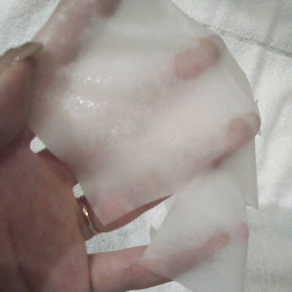 美容液たー〜っぷり!! シートにヒッタヒタに美容液たっぷり浸かってるので液だれ注意⚠️ シートは少し厚手で伸縮はあまりないけど大判でしっかりとしていて広げやすく顔もすっぽりとつつめました。 甘酒のようなお米の香りがほんのり🌿 トロミはあるけどサラッとした美容液なのでベタつきがなく シートを剥がしたあとのお肌は保湿がシッカリとされていてモッチり弾力のある肌質な感じ♡ パケも可愛いです🔆😆