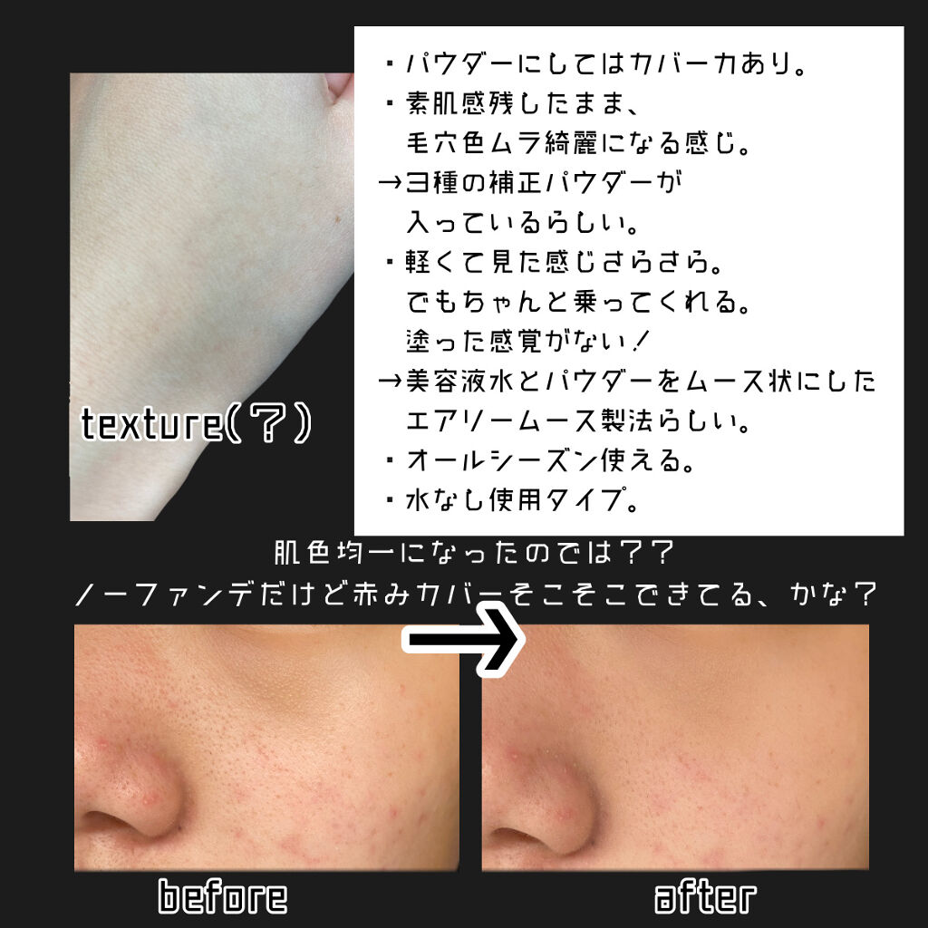 | 美容液水とパウダーをムース状にしたエアリームース製法で肌に軽やかにフィットしながらサラサラな感触を実現! | 詳細を見る | |