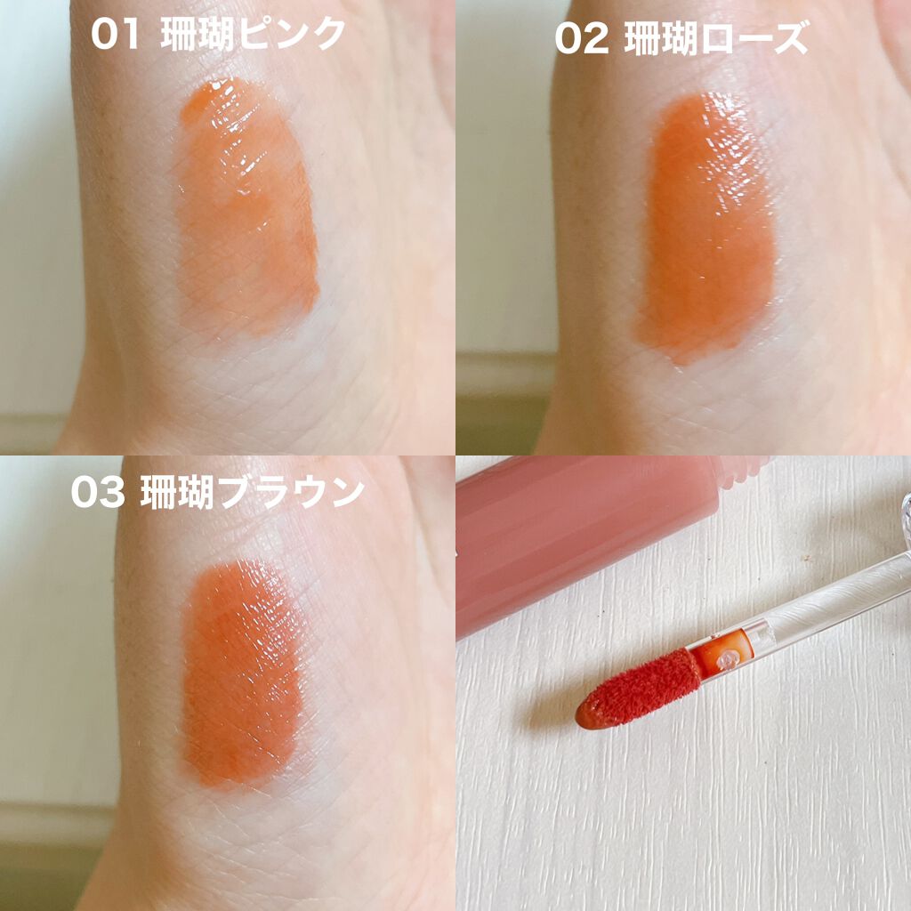 塗り心地と透けツヤ発色が好きで、お気に入りアイテムなので発売日にポチりました👍 色名から赤み強めを想像していたけど、黄味を感じるコーラル系ベージュ鮮やかすぎず使いやすいコーラルという印象のお色でした。 うるっとした質感で負担感がなく色もちもそこそこ良くてつい手が伸びるお気に入りアイテム💋