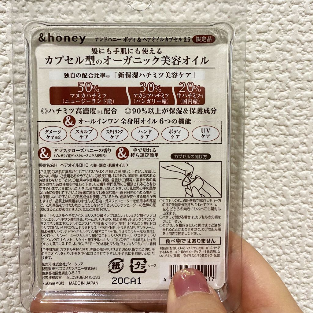- 「保水オーガニック美容」のはちみつヘアケアブランドの&honeyより全身に使用できるカプセル型の美容オイルが新登場。 ハチミツを配合した濃蜜な保湿カプセルで、手で簡単に切れるのも◎! お出かけ先や旅先でもスタイリングや保湿ケアが簡単に出来ます。 ・オールインワンオイルで6つの機能 1.ダメージケアオイルとして 2.頭皮マッサージオイルとして 3.濡れ髪スタイルを使用するスタイリングオイルとして 4.ハンド・ネイルケアオイルとして 5.ボディ保湿ケアオイルとして 6.UVケアとして 【100%モロッカンオーガニックオイル使用、無添加&フリー処方】