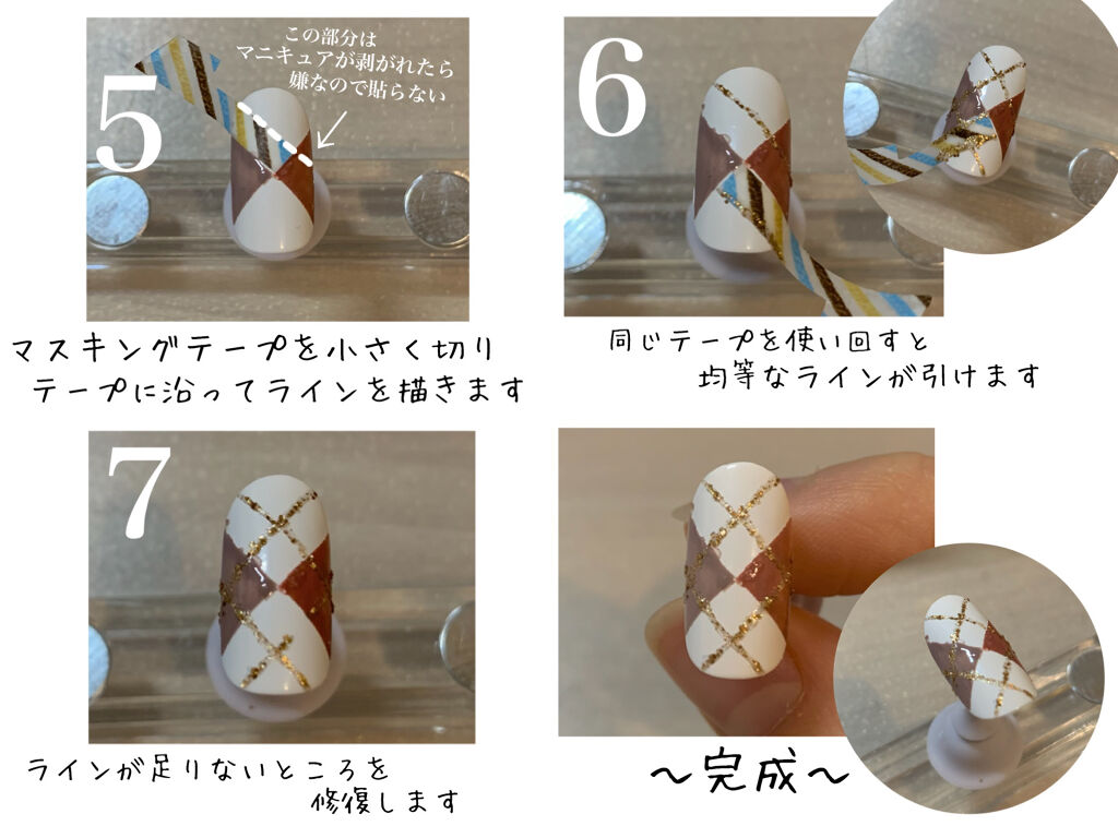 大人っぽカラーにハートで甘さをプラス💌 ニットコーデに合わせたいアーガイルネイル💅 細筆はダイソーのライン筆を使用しました🥰 人差し指は770番を2度塗り、小指はN17番を2度塗り、薬指はN02番を2度塗りして中央にハートシールを貼りました✨