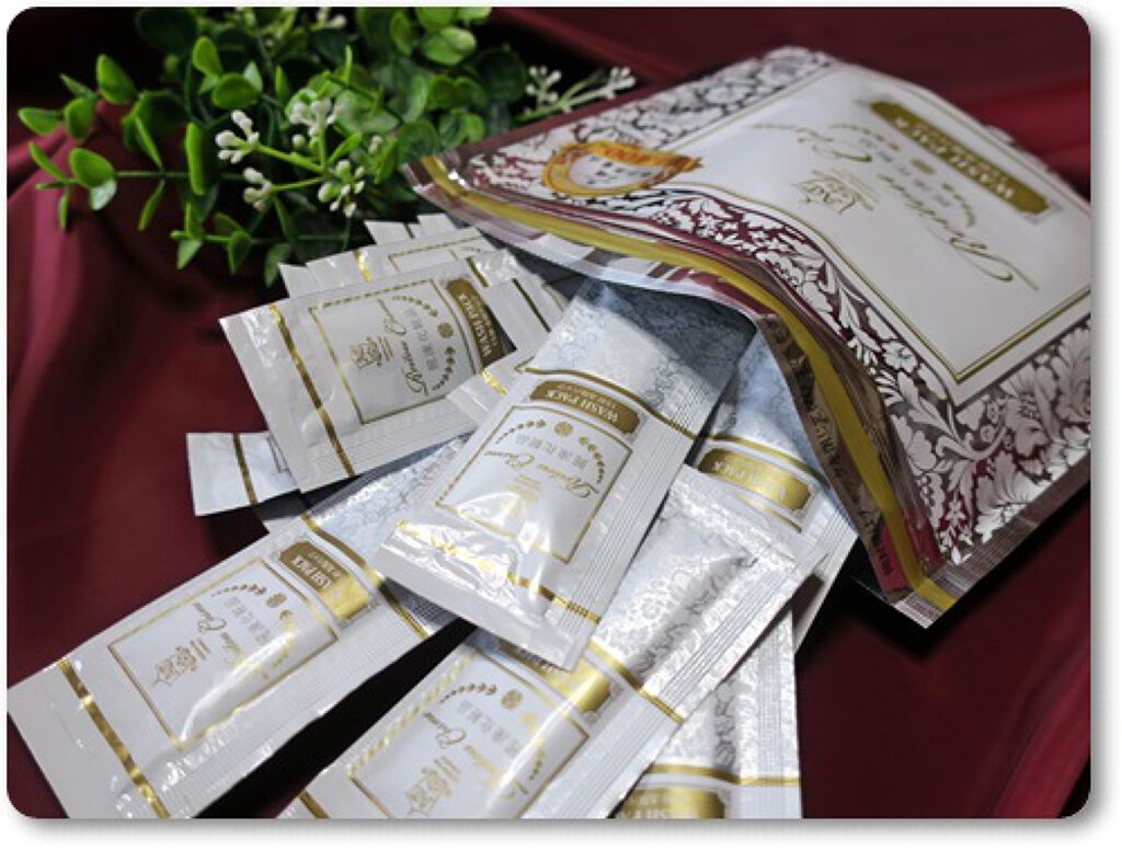 - 水、スクロース、米ヌカ、ハトムギ、グルコマンナン、ハチミツ、ローヤルゼリー、フコイダン、真珠パウダー、ラベンダー油、ゼラニウム油