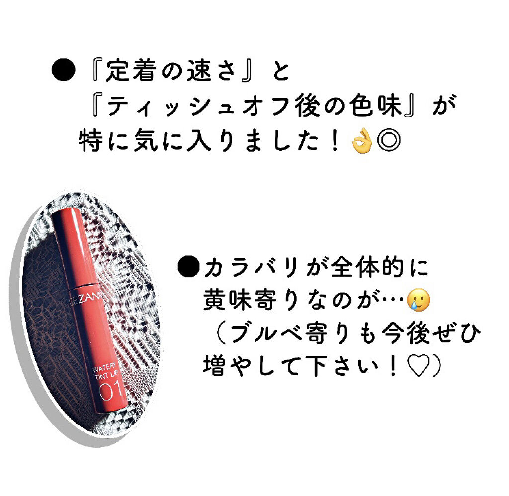 - ツヤ×色×潤いをキープする、セザンヌの新濡れツヤリップ みずみずしい濡れツヤ感ある仕上がりで、発色とツヤが長続きするティントリップです。ティントの発色を透明のベールで覆うリップコートのような処方で、ツヤ感と色をキープします。さらに、唇表面のべたつきは少なく、しっとり潤うオイルinウォーター処方を採用しています。