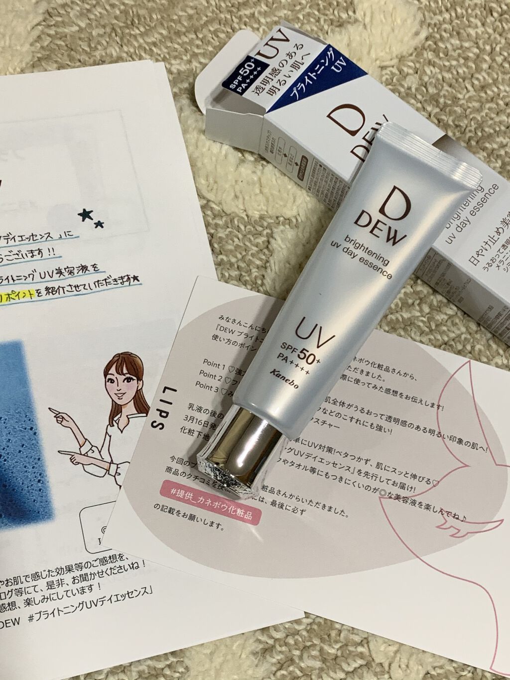カネボウ化粧品DEWブライトニングUVデイエッセンスLipsさんを通してカネボウさんのDEWブライトニングUVデイエッセンスをいただきました!まず目に飛び込んできたのはSPF50+PA++++夏にもってこいじゃない?まぁ、でも冬でも紫外線はあ...