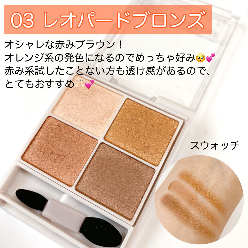 - しっとり密着!リッチな質感! 透けツヤ4色アイシャドウ シルクのようなツヤ感とスフレのようななめらかさ。 繊細なパールが配合されたやわらかなしっとりパウダーで、上品な目元に仕上がります。 ※2023年8月〜パッケージ順次リニューアル。