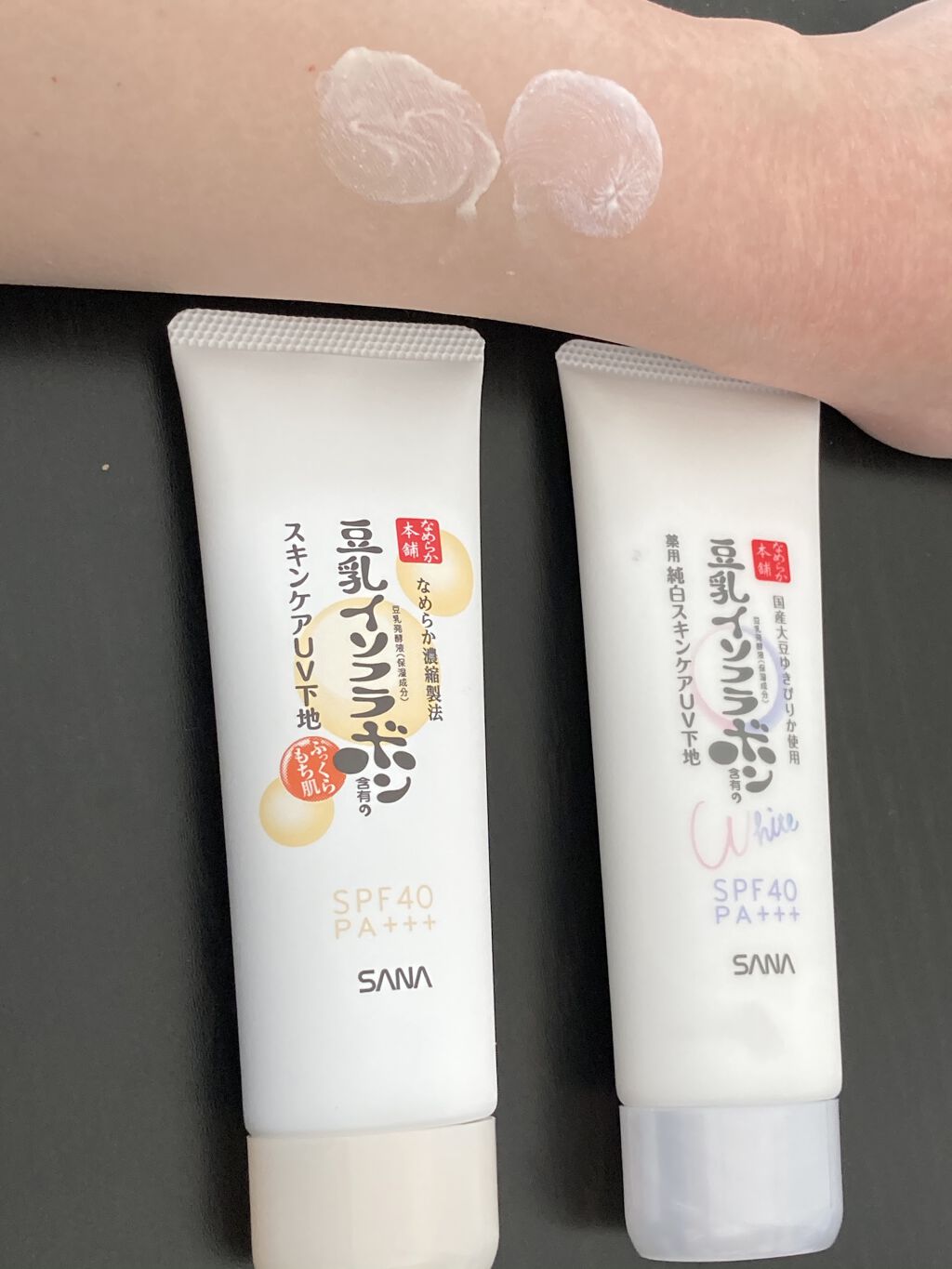 なめらか本舗オリジナルの豆乳発酵液配合(保湿成分)UV下地ですが保湿クリームのような使い心地です。ほんのり肌色で肌色補正*2、ベタ付かずサラッとしていました。 なめらか本舗美白*1ラインオリジナルの豆乳発酵液に加え美白*1有効成分のアルブチンと肌荒れ防止成分を配合。テクスチャはなめらか、肌にスーッと伸ばしやすく白浮きせず肌に馴染んで、トーンアップ*2を感じます。