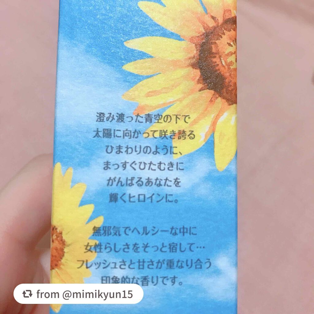 - 太陽に負けずにきらめく私へ! 幸せが咲く ひまわりの香り トップはグレープフルーツとマスカットが咲き誇るひまわりのように明るく弾けます。ミドルノートのジャスミンとオレンジフラワーで女性らしさを演出。ラストは、クリスタルムスク、ウッディーが青空のように穏やかに香ります。