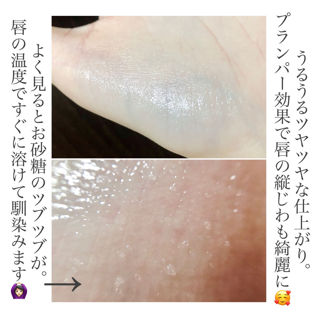 角質ケアができるシュガーリップスクラブです。こちらはクリアタイプですが色つきもあるようです^^保湿成分も入っていて使いやすいです。 優しく塗った後にしばらく放置してからやさしくこするとふるい角質がオフされてふっくらした綺麗な唇になります。私は夜寝る前に塗ったりしていました!✨️ 簡単にリップケアができるお気に入りアイテムです。使い切ったのでリピも考えています🫶