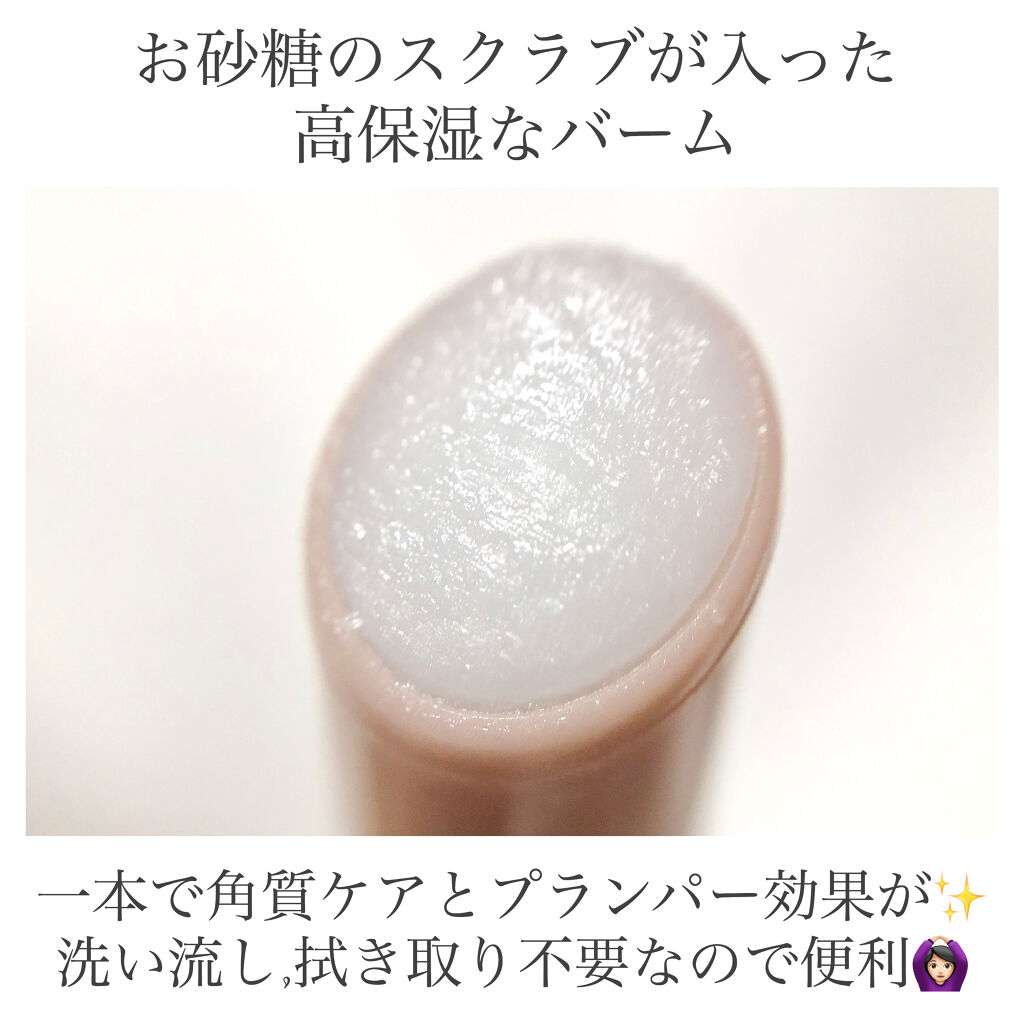 - 塗るだけで手軽に「柔らか唇エステ」 潤い&角質ケアができるリップスクラブ。 唇の上で溶けるお砂糖のスクラブが古い角質を優しくオフして、なめらかな唇に整えます。 リップパックした後のような高保湿が持続します。 拭き取り・洗い流し不要なので、外出先でも手軽にケアできます。 清涼感のある使い心地 ・スクラブ目的として砂糖の粒子を配合しておりますが、唇の状態によって刺激に感じられる可能性がございますのでご注意ください。 ・強くこすると刺激を感じることがあります。こすりすぎないように注意してください。 ・大変柔らかいバームですので、1㎜程度繰り出してお使いください。 ・一度繰り出したバームは戻りませんのでご注意ください。