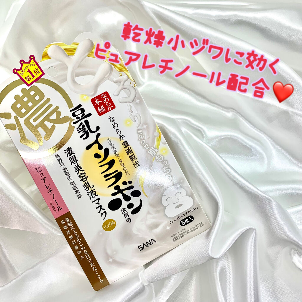 肌もっちりぷるぷる 《なめらか本舗》豆乳イソフラボンリンクルシートマスクN 20枚入り 大容量でとても使いやすかったパックです。ほどよい厚さのシートで5分~10分のお手軽マスク。 ピュアレチノール入りなので主に寝る前に使用していました。