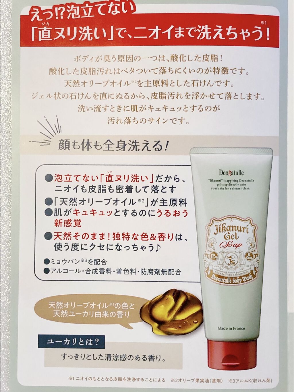 - \11年間ず~っと売上No.1*直ヌリ制汗デオドラントブランド/ 泡立てずに!オリーブのジェルの力で皮脂・ニオイまで**洗い落とす全身洗浄料「直ヌリジェル石けん」 ◆◆商品特長◆◆ 1.ニオイの原因となる酸化した皮脂汚れをすっきりと落としながら、うるおいは保つ 2.肌がキュキュッとする、新感覚のすっきりとした洗いあがり 3.主原料は天然オリーブオイル***で合成香料、着色料、防腐剤、無添加 オリーブとユーカリ由来の天然の色と香り 4.ミョウバン配合**** ◆◆こんな方へおすすめ◆◆ ・日ごろから制汗デオドラントを使っている人 ・いつも使っているボディソープでは汗やニオイがすっきり落とせていない気がする人 ・とにかく汗・ニオイをしっかり落としたいと思っている人 ==注意== ●お肌に合わないとき、傷、はれもの、湿疹等、異常のあるときは使用しない。●使用中、赤み、はれ、かゆみ、刺激等の異常があらわれたときは使用を中止し、皮フ科専門医等に相談する。そのまま使用を続けると症状が悪化する場合がある。●目に入らないよう注意し、万一目に入った場合は、すぐに洗い流す。異常が残る場合は眼科医に相談する。●使用後はキャップをしっかり閉め、直射日光のあたる場所、極端に高温、低温、または多湿の場所を避けて保管する。●乳幼児の手の届くところに置かない。 販売名:DNジェルソープa *インテージSRI+制汗剤市場 2013年5月~2024年4月 ソフトストーンW(販売名:デオナチュレソフトストーンEX(リニューアル前処方)・DN薬用スティックFe)累計販売金額 **ニオイの元となる皮脂を洗浄することによる ***基剤:オリーブ果実油 ****アルムK(収れん剤)