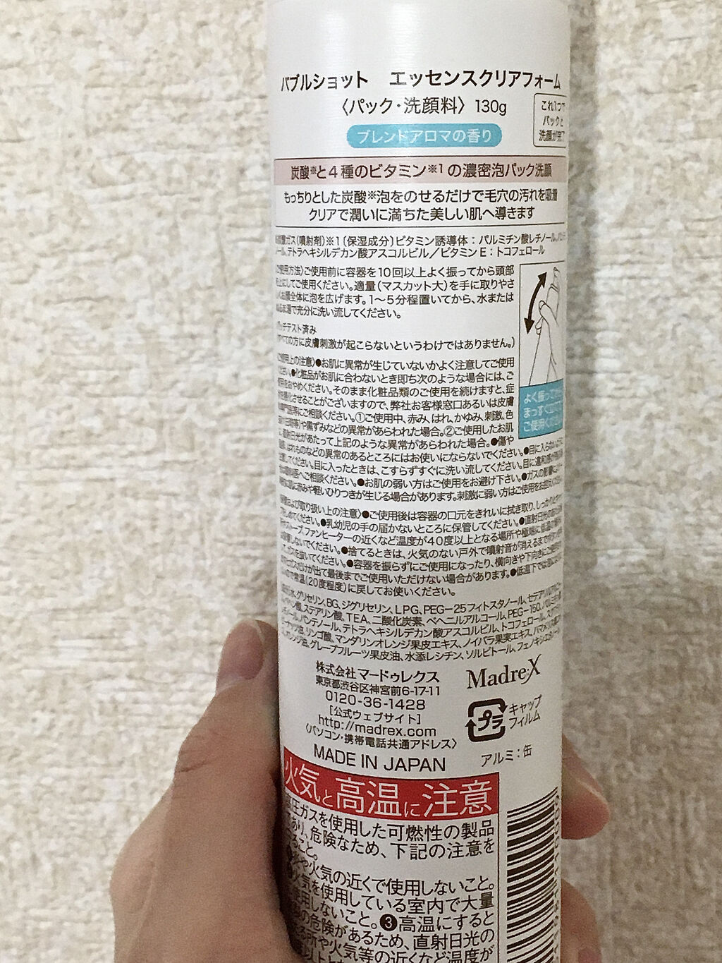 - 炭酸ガス(噴射剤)を11,000ppm配合した濃密な泡が特長の高濃度炭酸洗顔料です。毛穴より小さな炭酸泡が、毛穴に入り込み、黒ずみや古い角質を吸着オフします。また4種のビタミン※1と角質クリア成分※2のダブル効果で、潤い、くすみ※3のない透明素肌へ導きます。 ※1パルミチン酸レチノール、パンテノール、テトラヘキシルデカン酸アスコルビル、ビタミンE(すべて保湿剤) ※2リンゴ酸(角質ケア成分)、マンダリンオレンジ果皮エキス(保湿剤) ※3汚れや古い角質のこと