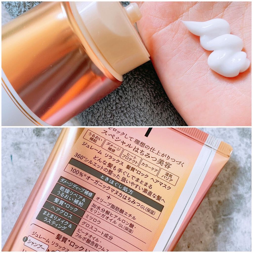 - 髪質で選ぶ、髪質*が変わる、新ジュレーム リラックス。 進化した独自の補整メカニズムでまとまり続く。 360°シルエットの整った髪へ。 ・髪質タイプ:かたいパサつく ・仕上がり:超しっとりやわらかソフト&モイスト ・ときほぐす:100%※オーガニックマヌカはちみつ ・うるおい洗浄:やさしくしっとり洗うアミノ酸系洗浄成分 ・髪質*コントロール:ゴワつくキューティクルをケアする成分 ・髪質*メモリー:モイストコート成分 ・乾燥リペア:加水分解ヒアルロン酸 ・まとまりメイク&ラスティング:ピーチオイル・フルボ酸含有フムスエキス ・香り:ふわりと心をときほぐすフローラルハニーの香り。 *なめらかさ・うるおい感などの髪の質感のこと