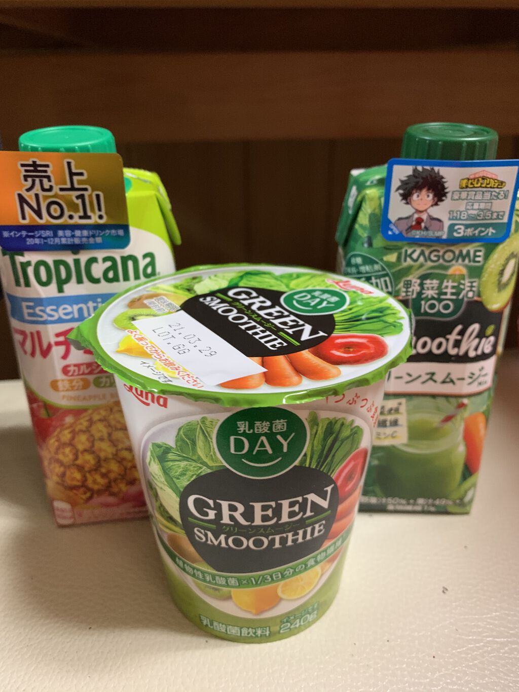 野菜生活100グリーンスムージー小腹がすいた時にコンビニで買いました。キウイの味が強いです。なので想像より酸っぱかった💦甘さは控えめです。砂糖・甘味料・増粘剤無添加なのが嬉しいですね。スムージーなのでトロリとしていて空腹時でも胃に優しく小腹満...