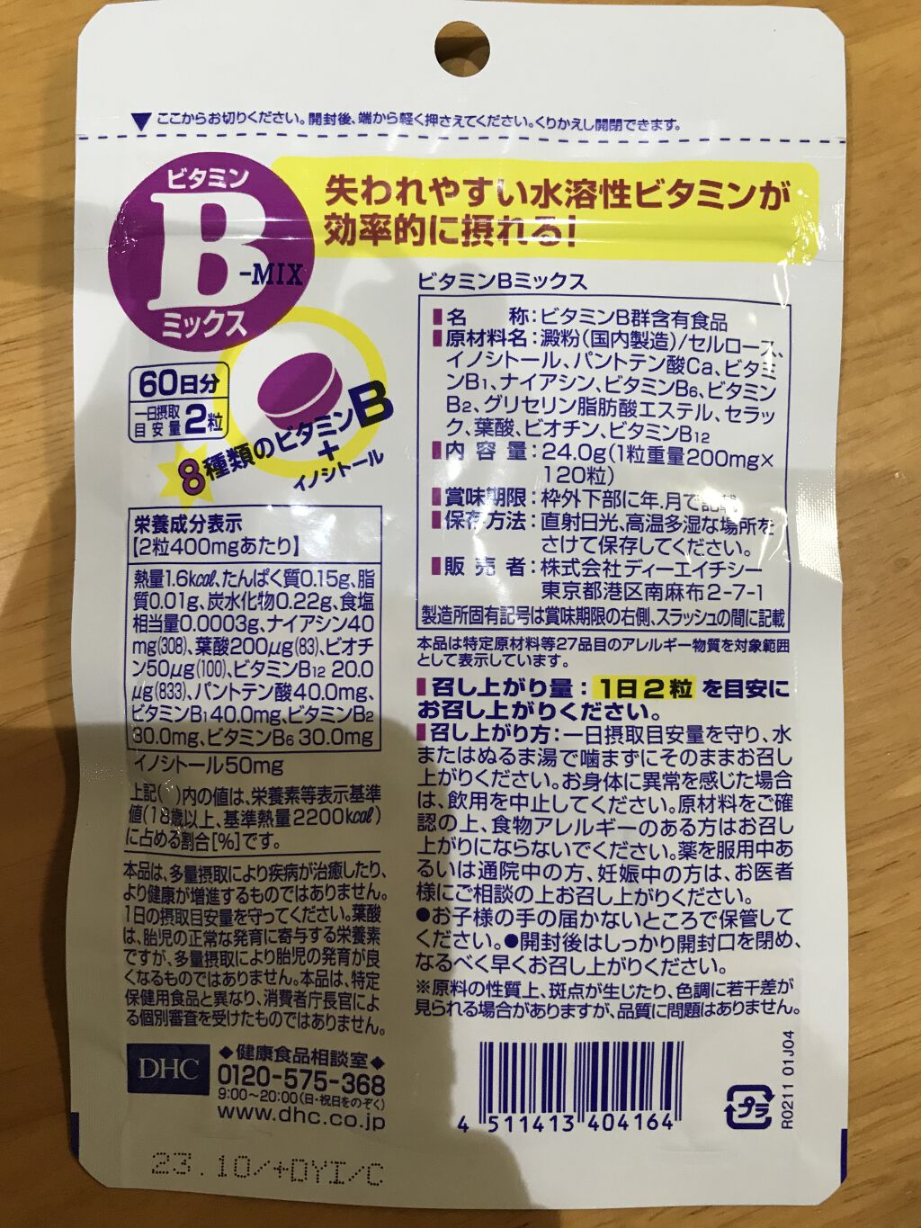 - ビタミンB群は、糖分やたんぱく質などの栄養素をエネルギーにかえる必須ビタミン。 美容やスタミナ、ダイエット中の栄養補給などに欠かせないビタミンB1、B2、B6、B12、ナイアシン、パントテン酸、ビオチン、葉酸のビタミンB群全8種類にイノシトールを、バランスよく配合しました。 栄養機能表示 ●ビタミンB12及び葉酸は、赤血球の形成を助ける栄養素です。 ●ナイアシン及びビオチンは、皮膚や粘膜の健康維持を助ける栄養素です。 ●葉酸は、胎児の正常な発育に寄与する栄養素です。 ※葉酸は、胎児の正常な発育に寄与する栄養素ですが、多量摂取により胎児の発育が良くなるものではありません。 ※水またはぬるま湯で噛まずにそのままお召し上がりください。 ※本品は、多量摂取により疾病が治癒したり、より健康が増進するものではありません。一日の摂取目安量を守ってください。 ※本品は、特定保健用食品と異なり、消費者庁長官による個別審査を受けたものではありません。 ※原料の性質上、斑点が生じたり、色調に若干差が見られる場合がありますが、品質に問題はありません。 【名称】 ビタミンB群含有食品 【原材料名】 澱粉(国内製造)/セルロース、イノシトール、パントテン酸Ca、ビタミンB1、ナイアシン、ビタミンB6、ビタミンB2、微粒二酸化ケイ素、ステアリン酸Ca、セラック、葉酸、ビオチン、ビタミンB12 【飲み方】 一日の摂取目安量2粒 【栄養成分表示[2粒400mgあたり]】 熱量1.6kcal、たんぱく質0.15g、脂質0.01g、炭水化物0.22g、食塩相当量0.0004g、ビタミンB1 40.0mg、ビタミンB2 30.0mg、ビタミンB6 30.0mg、ビタミンB12 20.0μg(833)、ナイアシン40mg(308)、パントテン酸40.0mg、ビオチン50μg(100)、葉酸200μg(83)、イノシトール50mg ※上記( )内の値は、栄養素等表示基準値(18歳以上、基準熱量2200kcal)に占める割合[%]です。 ※一日の目安量を守って、お召し上がりください。 ※お身体に異常を感じた場合は、摂取を中止してください。 ※特定原材料及びそれに準ずるアレルギー物質を対象範囲として表示しています。原材料をご確認の上、食物アレルギーのある方はお召し上がりにならないでください。 ※薬を服用中あるいは通院中の方、妊娠中の方は、お医者様にご相談の上お召し上がりください。 ●直射日光、高温多湿な場所をさけて保存してください。 ●お子様の手の届かないところで保管してください。 ●開封後はしっかり開封口を閉め、なるべく早くお召し上がりください。 食生活は、主食、主菜、副菜を基本に、食事のバランスを。
