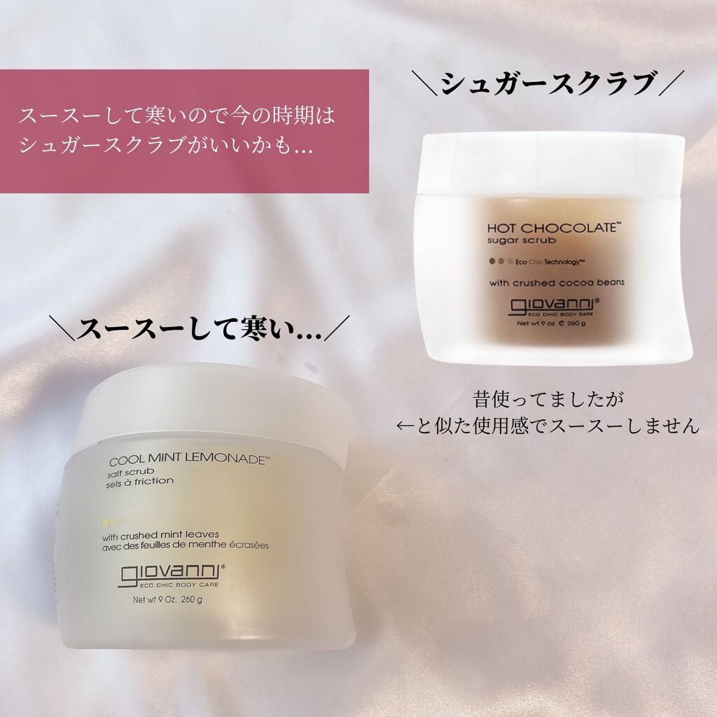 ジョヴァンニボディスクラブ(CM)チョコのスクラブは有名で知ってたけど、大好きな柑橘系があるとは!!クールミントレモネード!めっちゃいい香り!!!テクスチャにまずびっくりした!なんやろ、普通のスクラブってしゃりしゃり...