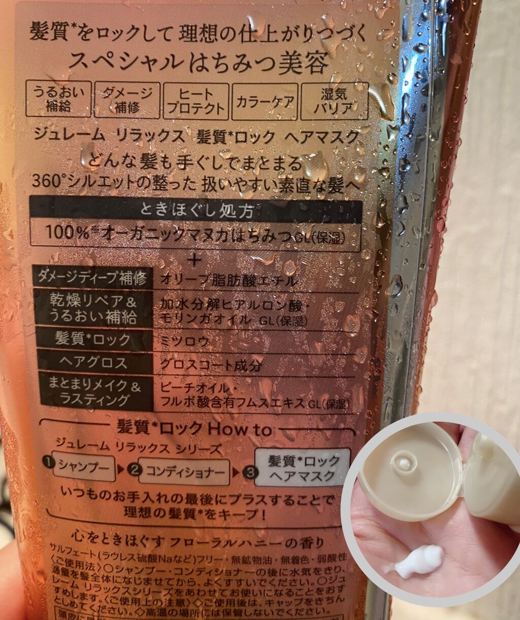 - 髪質で選ぶ、髪質*が変わる、新ジュレーム リラックス。 進化した独自の補整メカニズムでまとまり続く。 360°シルエットの整った髪へ。 ・髪質タイプ:かたいパサつく ・仕上がり:超しっとりやわらかソフト&モイスト ・ときほぐす:100%※オーガニックマヌカはちみつ ・うるおい洗浄:やさしくしっとり洗うアミノ酸系洗浄成分 ・髪質*コントロール:ゴワつくキューティクルをケアする成分 ・髪質*メモリー:モイストコート成分 ・乾燥リペア:加水分解ヒアルロン酸 ・まとまりメイク&ラスティング:ピーチオイル・フルボ酸含有フムスエキス ・香り:ふわりと心をときほぐすフローラルハニーの香り。 *なめらかさ・うるおい感などの髪の質感のこと