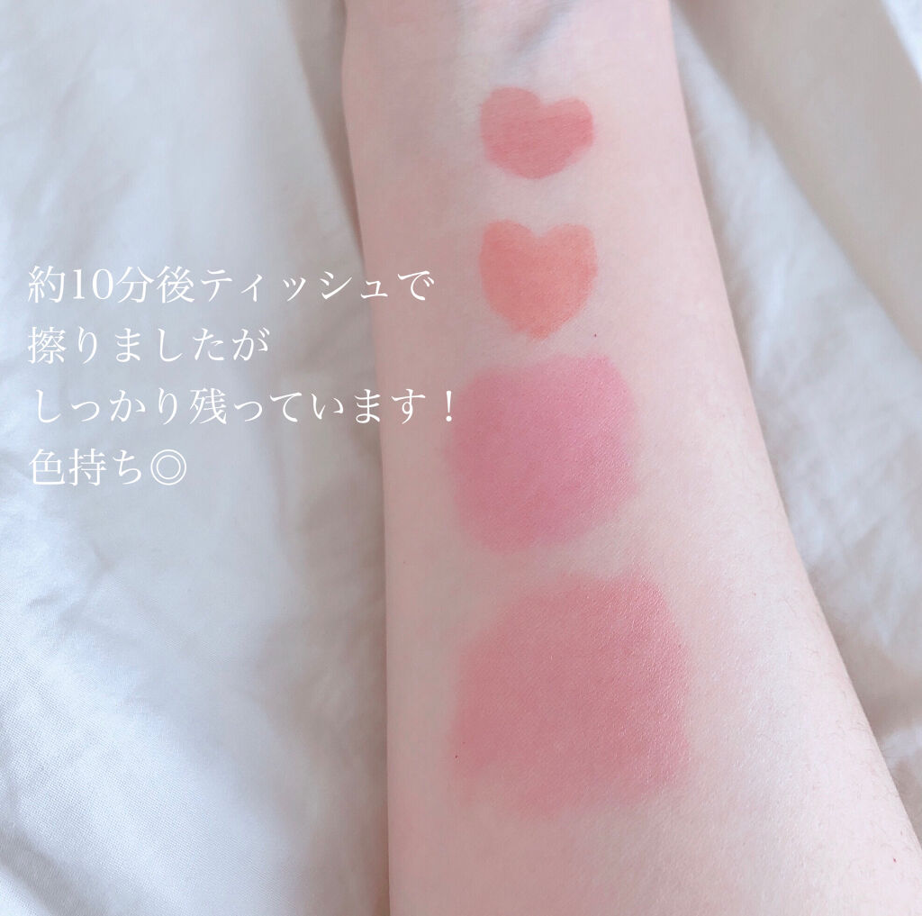 | リップティントランキング第49位 | 唇にピタッと密着しているような感じがあり、なじみが良い 1度塗りだと薄づきでナチュラルな発色になり、塗り重ねていくとしっかり発色して可愛い | 詳細を見る | |