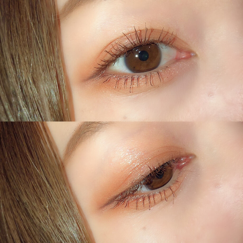 よくパレットのなかで明るいカラーをベースにまぶたに広く塗ることが多いのですが、パール感のあるカラーを避ける🙆♀️! パール感たっぷりの明るいカラーは涙袋に使うぐらい光を集めてぷっくり見せてくれるので、まぶたに広く使うと腫れぼったく見えがち😓 目元を明るくみせてくれたり、次に使うアイシャドウをぼかしやすくしてくれるけど、すっ飛ばしてメインのカラーを塗っちゃう✊🏻❤️🔥 涙袋にはたっぷり塗ってぷっくり見せる🙆♀️💕 シルキースフレアイズのマットタイプはすごく優れているな〜と感じました☺️💗 赤やオレンジなどは、入れすぎると腫れぼったく見えやすいので、見せたいカラーは下まぶた目尻にのせて色をたのしむ♡♡ パール感なしの透けマットだけじゃ物足りない… そう感じさせない華やかなラメが左上に入っているので黒目上と涙袋にのせるとすごく可愛い仕上がりに😍! 厄介な左右差のお陰でマットアイシャドウが好きになりました😌💕