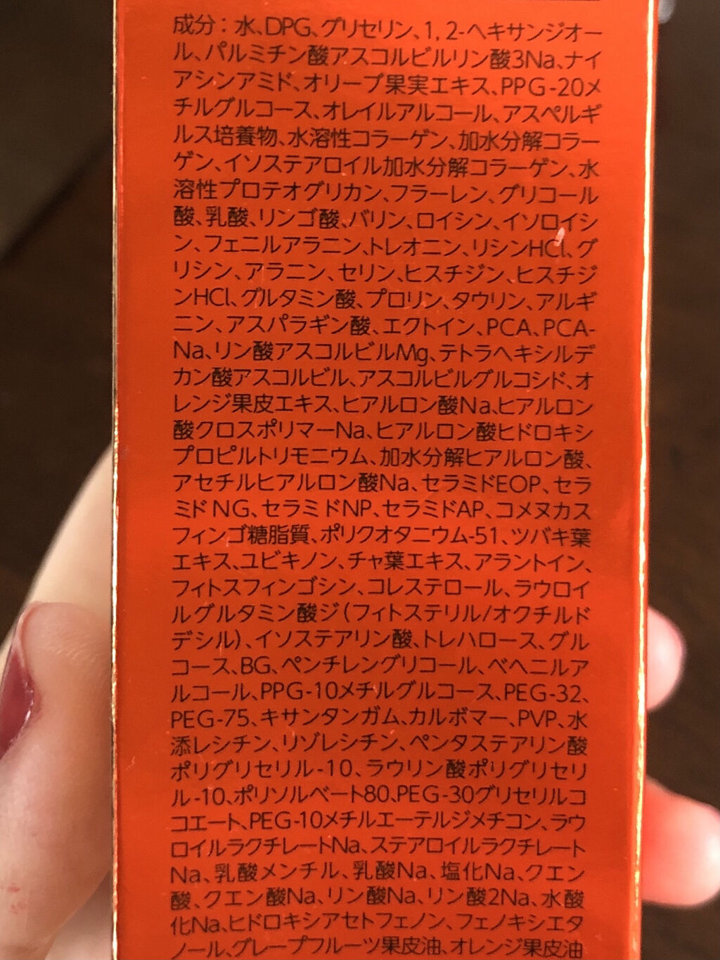 - <150ml> 水、DPG、グリセリン、1,2-ヘキサンジオール、パルミチン酸アスコルビルリン酸3Na、3-O-エチルアスコルビン酸、ナイアシンアミド、加水分解コラーゲン、水溶性コラーゲンクロスポリマー、ヒアルロン酸Na、加水分解ヒアルロン酸、アセチルヒアルロン酸Na、BG、PCA-Na、PEG-10メチルエーテルジメチコン、PEG-30グリセリルココエート、PEG-32、PEG-75、PPG-10メチルグルコース、PPG-20メチルグルコース、アルギニン、グリコール酸、トレハロース、ポリクオタニウム-51、ポリソルベート80、乳酸メンチル、クエン酸Na、フェノキシエタノール、グレープフルーツ果皮油、オレンジ果皮油 <285ml(ポンプタイプ)> 水、DPG、グリセリン、1,2-ヘキサンジオール、パルミチン酸アスコルビルリン酸3Na、3-O-エチルアスコルビン酸、ナイアシンアミド、加水分解コラーゲン、水溶性コラーゲンクロスポリマー、ヒアルロン酸Na、加水分解ヒアルロン酸、アセチルヒアルロン酸Na、BG、PCA-Na、PEG-10メチルエーテルジメチコン、PEG-30グリセリルココエート、PEG-32、PEG-75、PPG-10メチルグルコース、PPG-20メチルグルコース、アルギニン、グリコール酸、トレハロース、ポリクオタニウム-51、ポリソルベート80、乳酸メンチル、クエン酸Na、フェノキシエタノール、グレープフルーツ果皮油、オレンジ果皮油 <28ml> 水、DPG、グリセリン、1,2-ヘキサンジオール、パルミチン酸アスコルビルリン酸3Na、3-O-エチルアスコルビン酸、ナイアシンアミド、加水分解コラーゲン、水溶性コラーゲンクロスポリマー、ヒアルロン酸Na、加水分解ヒアルロン酸、アセチルヒアルロン酸Na、BG、PCA-Na、PEG-10メチルエーテルジメチコン、PEG-30グリセリルココエート、PEG-32、PEG-75、PPG-10メチルグルコース、PPG-20メチルグルコース、アルギニン、グリコール酸、トレハロース、ポリクオタニウム-51、ポリソルベート80、乳酸メンチル、クエン酸Na、フェノキシエタノール、グレープフルーツ果皮油、オレンジ果皮油 <150ml(ポンプタイプ)> 水、DPG、グリセリン、1,2-ヘキサンジオール、パルミチン酸アスコルビルリン酸3Na、3-O-エチルアスコルビン酸、ナイアシンアミド、加水分解コラーゲン、水溶性コラーゲンクロスポリマー、ヒアルロン酸Na、加水分解ヒアルロン酸、アセチルヒアルロン酸Na、BG、PCA-Na、PEG-10メチルエーテルジメチコン、PEG-30グリセリルココエート、PEG-32、PEG-75、PPG-10メチルグルコース、PPG-20メチルグルコース、アルギニン、グリコール酸、トレハロース、ポリクオタニウム-51、ポリソルベート80、乳酸メンチル、クエン酸Na、フェノキシエタノール、グレープフルーツ果皮油、オレンジ果皮油 <100ml(旧商品)> 水、BG、グリセリン、ヒアルロン酸Na、加水分解ヒアルロン酸、フェノキシエタノール、オレンジ果皮油、アルギニン、DPG、加水分解コラーゲン、PEG-10メチルエーテルジメチコン、乳酸メンチル、トレハロース、ポリクオタニウム-51、アセチルヒアルロン酸Na、PCA-Na、3-O-エチルアスコルビン酸、パルミチン酸アスコルビルリン酸3Na、1,2-ヘキサンジオール、PEG-32、クエン酸Na、グリコール酸、グレープフルーツ果皮油、PEG-75、ポリソルベート80、ナイアシンアミド、水溶性コラーゲンクロスポリマー、PEG-30グリセリルココエート、PPG-10メチルグルコース、PPG-20メチルグルコース <285mL(レフィル)> 水、BG、グリセリン、ヒアルロン酸Na、加水分解ヒアルロン酸、フェノキシエタノール、オレンジ果皮油、アルギニン、DPG、加水分解コラーゲン、PEG-10メチルエーテルジメチコン、乳酸メンチル、トレハロース、ポリクオタニウム-51、アセチルヒアルロン酸Na、PCA-Na、3-O-エチルアスコルビン酸、パルミチン酸アスコルビルリン酸3Na、1,2-ヘキサンジオール、PEG-32、クエン酸Na、グリコール酸、グレープフルーツ果皮油、PEG-75、ポリソルベート80、ナイアシンアミド、水溶性コラーゲンクロスポリマー、PEG-30グリセリルココエート、PPG-10メチルグルコース、PPG-20メチルグルコース <スペシャル ミニボトル 28ml> 水、DPG、グリセリン、1,2-ヘキサンジオール、パルミチン酸アスコルビルリン酸3Na、アスコルビルリン酸Na、ナイアシンアミド、ヒアルロン酸Na、加水分解ヒアルロン酸、加水分解コラーゲン、ポリクオタニウム-61、BG、PEG-30グリセリルココエート、PEG-32、PEG-75、PPG-10メチルグルコース、PPG-20メチルグルコース、アルギニン、トレハロース、ポリクオタニウム-51、ポリソルベート80、乳酸メンチル、クエン酸Na、フェノキシエタノール、グレープフルーツ果皮油、オレンジ果皮油