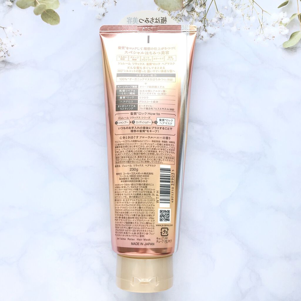 - 髪質で選ぶ、髪質*が変わる、新ジュレーム リラックス。 進化した独自の補整メカニズムでまとまり続く。 360°シルエットの整った髪へ。 ・髪質:ねこっ毛、からまる ・仕上がり:ふわりなめらかエアリー&スムース ・ときほぐす:100%※オーガニックマヌカはちみつ ・うるおい洗浄:ツルツルなめらかに洗うタウリン系洗浄成分 ・髪質*コントロール:やせ細ったキューティクルをケアする成分 ・髪質*メモリー:スムースコート成分 ・乾燥リペア:加水分解ヒアルロン酸 ・まとまりメイク&ラスティング:ピーチオイル・フルボ酸含有フムスエキス ・香り:ふわりと心をときほぐすフローラルハニーの香り。 *なめらかさ・うるおい感などの髪の質感のこと