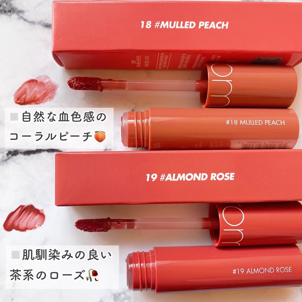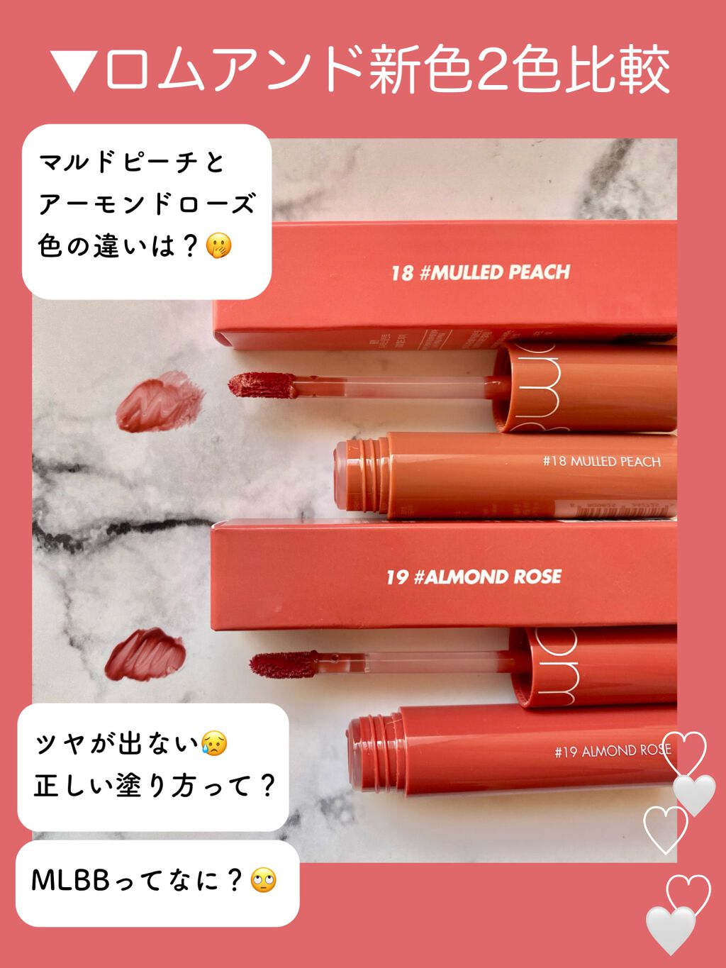 ロムアンドのジューシーラスティングティントで解決! 色持ちの良さは勿論のこと、ツヤ感やうるおいとも両立が可能です😄🌸 19 ALMOND ROSEはくすみ感のあるローズカラーでかわいくてお気に入り! 絶妙な色合いなのですが、元から血色の良い唇のように仕上げてくれ、ナチュラルになじんでくれるので何方でも使いやすいと思います。 20 DARK COCONUTは塗り重ねる程深みを出すことのできる、ダークなカラー。 チョコレートのような色味で、いつもよりも大人に、ちょっと背伸びをしたいなという時に特にオススメです。