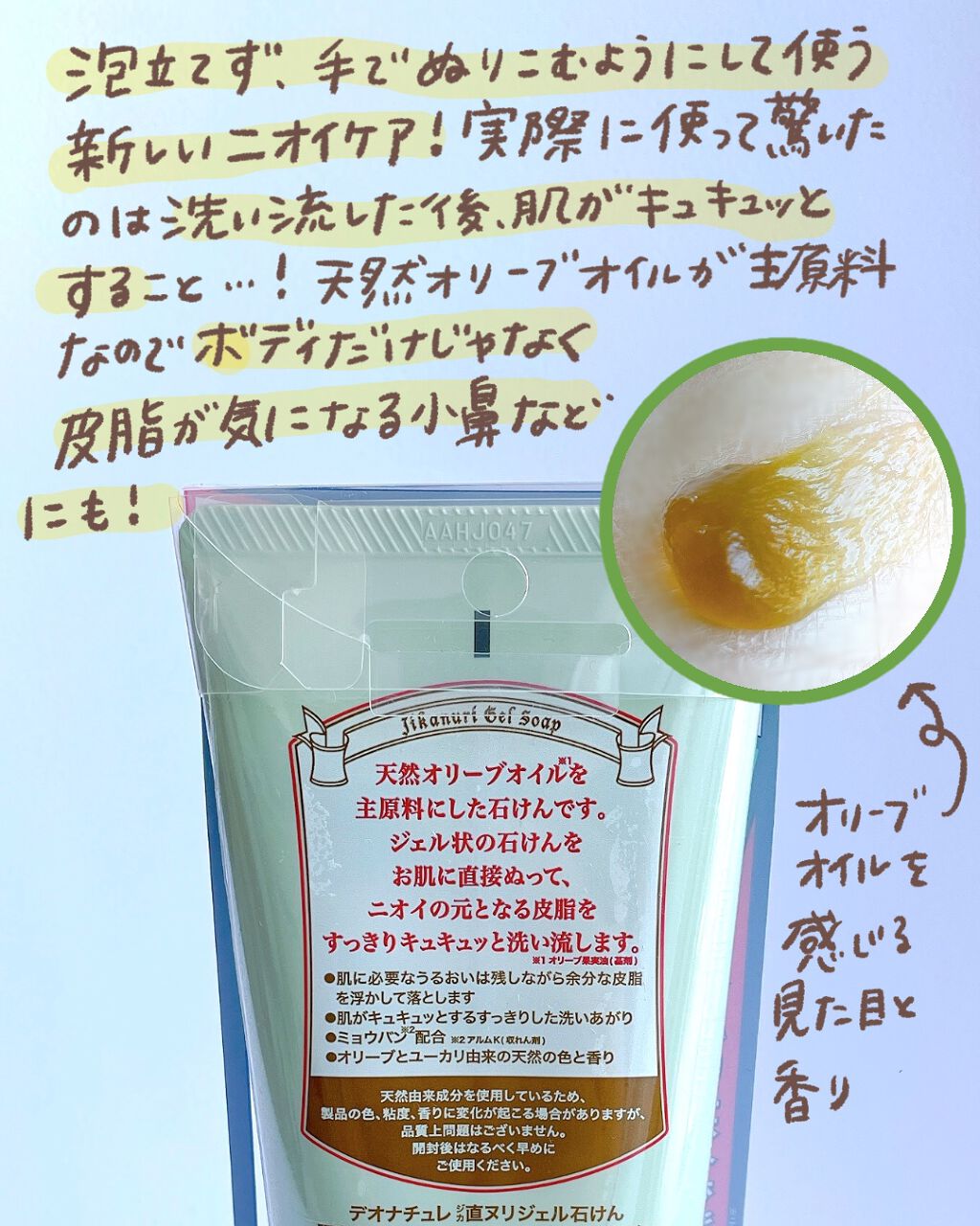 - \11年間ず~っと売上No.1*直ヌリ制汗デオドラントブランド/ 泡立てずに!オリーブのジェルの力で皮脂・ニオイまで**洗い落とす全身洗浄料「直ヌリジェル石けん」 ◆◆商品特長◆◆ 1.ニオイの原因となる酸化した皮脂汚れをすっきりと落としながら、うるおいは保つ 2.肌がキュキュッとする、新感覚のすっきりとした洗いあがり 3.主原料は天然オリーブオイル***で合成香料、着色料、防腐剤、無添加 オリーブとユーカリ由来の天然の色と香り 4.ミョウバン配合**** ◆◆こんな方へおすすめ◆◆ ・日ごろから制汗デオドラントを使っている人 ・いつも使っているボディソープでは汗やニオイがすっきり落とせていない気がする人 ・とにかく汗・ニオイをしっかり落としたいと思っている人 ==注意== ●お肌に合わないとき、傷、はれもの、湿疹等、異常のあるときは使用しない。●使用中、赤み、はれ、かゆみ、刺激等の異常があらわれたときは使用を中止し、皮フ科専門医等に相談する。そのまま使用を続けると症状が悪化する場合がある。●目に入らないよう注意し、万一目に入った場合は、すぐに洗い流す。異常が残る場合は眼科医に相談する。●使用後はキャップをしっかり閉め、直射日光のあたる場所、極端に高温、低温、または多湿の場所を避けて保管する。●乳幼児の手の届くところに置かない。 販売名:DNジェルソープa *インテージSRI+制汗剤市場 2013年5月~2024年4月 ソフトストーンW(販売名:デオナチュレソフトストーンEX(リニューアル前処方)・DN薬用スティックFe)累計販売金額 **ニオイの元となる皮脂を洗浄することによる ***基剤:オリーブ果実油 ****アルムK(収れん剤)