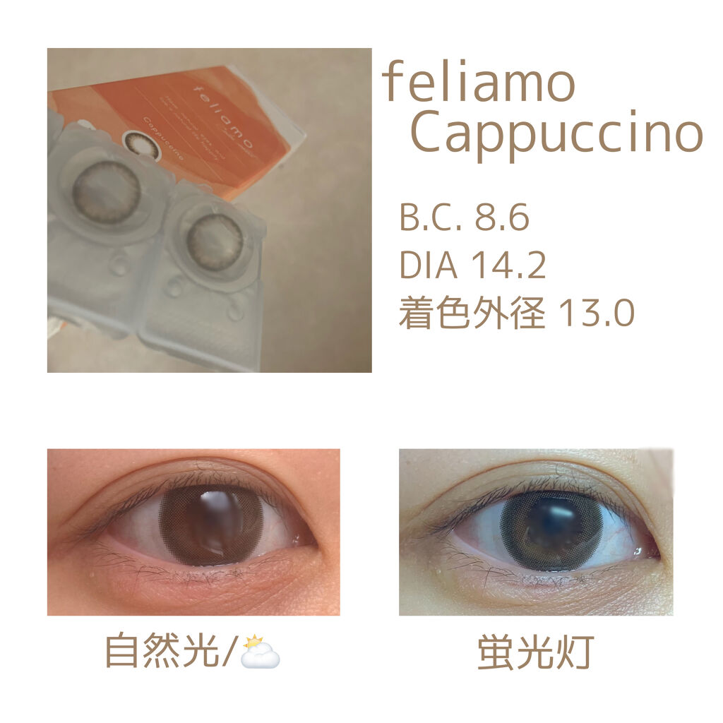 - ※2025年6月以降、商品パッケージ裏面・側面の一部表記を順次変更いたします。尚、これにかかる商品の交換・返品は承っておりません。 どんな瞬間にも溶け込む誰からも愛される瞳へ feliamoの由来は felice amore~幸せな愛~ 瞳から愛されオーラを放つ好印象レンズで女性らしさと品を演出。 オンも、オフも、特別な日も。 どんな場面にも溶け込むレンズラインナップで誰からも愛される瞳に。 UV CUT Feature1 肌や瞳に有害といわれ、白内障などの眼病を引き起こす危険性のある紫外線を99%カットします。(UV-A波75%、UV-B波99%カット) イオン性 Feature1 水分を多く含み酸素を通しやすいため瞳にやさしい使い心地で、快適な装用感です。 高含水 Feature1 水分が多く含むやわらかい素材で、快適なつけ心地です。 レンズ構造 Feature1 まぶた側に着色剤を内包しているため、角膜に色素が触れることがない構造を採用しています。 レンズ形状 Feature1 フチを丸みのある形状にすることで自然な装用感を実現しました。 ※装用感には個人差があります。 カラーコンタクトレンズの不適正使用による眼障害の危険性等などがあります。 ●コンタクトレンズは高度管理医療機器です。不十分な洗浄・消毒など不適切なケアや、長時間・交換期間を超えた装用により、アレルギー性結膜炎、角膜感染症、角膜潰瘍等の重篤な眼障害が発生する危険性があります ●ご使用前に取扱説明書を確認してください 使用上の留意事項 ●眼科医院等を受診してからお求めください ●眼に異常を感じたら直ちにレンズ使用を中止し、お近くの眼科等で診察を受けてください ●医師の指示にしたがってご使用ください ●コンタクトレンズを装用する場合、自覚症状がなくても、眼科医院等での定期検査を受けてください ●レンズに不具合がある場合は使用しないでください