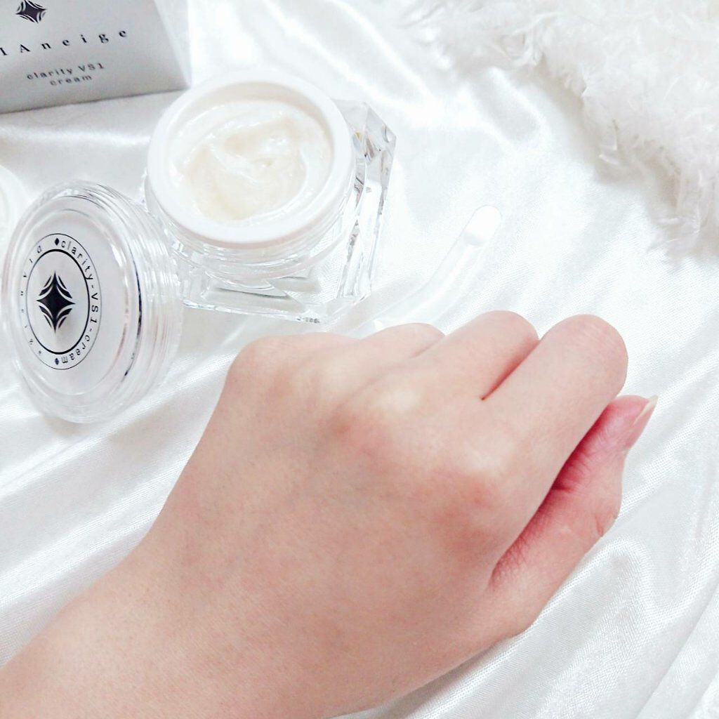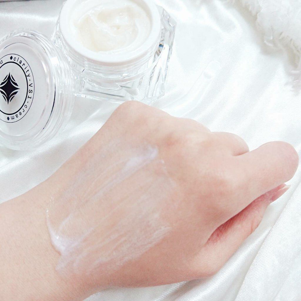 - 『クラリティVS1クリーム』は、ダウンタイムの回復、ニキビ跡のケアやシミ、アンチエイジングなど幅広い要望に応えるため、何度も試作を重ね、整形手術や美容レーザー後のダウンタイム時に使うクリームとして開発されました。 皮膚の表面ではなく内側から肌を活性化します。 1. 見た目は透明のクリーム。肌に塗ると白くなり、しばらくすると透明に変わります。 浸透する時に水分とエキスが混ざりあった際、発熱しその際に表面が白くなります。水分を吸着して肌に浸透するので、長時間の水分保持力でパック効果を発揮。そのため、保湿効果が高まります。 2. 高機能成分を使用しております。 高級ダイヤモンド末、超高圧まるごと馬プラセンタ、リンゴ幹細胞エキス、エーデルワイス成長点細胞培養液など。 3. バラペン、合成香料、石油系界面活性剤は使用しておりません。7種類のアロマオイルを独自ブレンド、さっぱり且つビターな柑橘系のリフレッシュ感に、高貴ジャスミンの香りを調合しました。 ジャスミン油、ネロリ、レモングラス油、ライム油、ブチグレン油、レモン果皮油、グレープフルーツ果皮油。