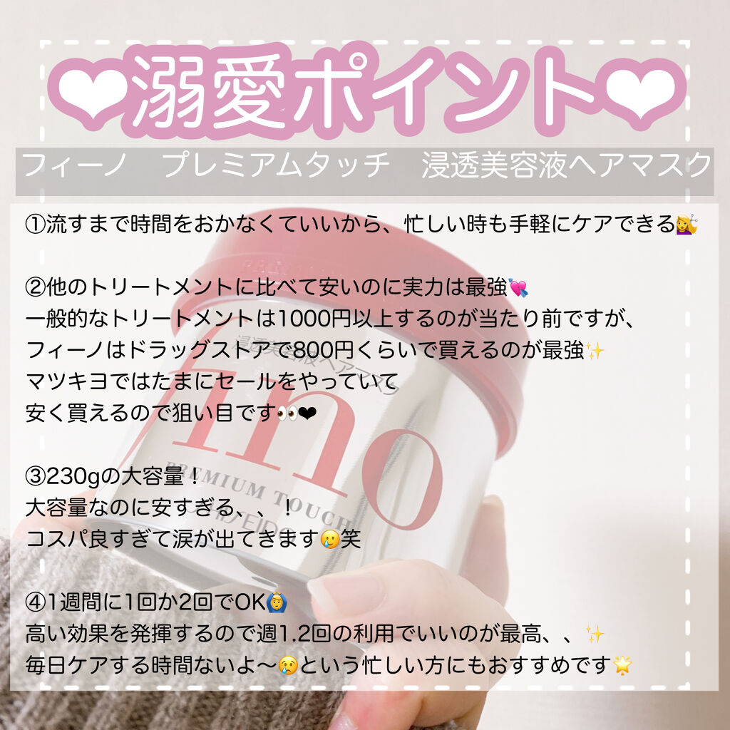 finoフィーノプレミアムタッチ濃厚美容液ヘアマスク230g/購入価格¥500(ドンキ)髪に浸透美容液🌟なめらかな髪に仕上げるヘアトリートメント傷みきった毛先までまるで根もとと同じくらいなめらかな髪に仕上げる◎とろけるように髪になじみ、髪1本...