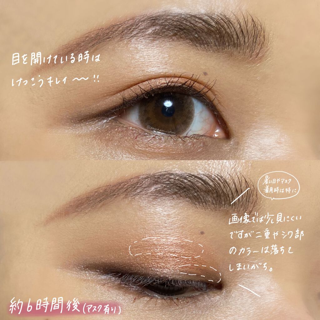 ①マット系シャドウの豊富さ→明暗が段階的にあるので、初心者さんでも簡単にグラデーションが作りやすい◎ ②ラメの持続力→目を擦ることが多く、涙も出やすい私なのですが、ラメを乗せたところは時間が経ってもしっかり残ってました!すごすぎ!! ③粉質◎→指塗りでもブラシ塗りでも粉飛びすることなく塗ることができました! ④密着力○→めちゃめちゃ良い!とは言えないのですが、時間経過後汚すぎる!!とは思わない程度の持ち具合でした😂 ⑤アイブロウにも使える→GHI、DHIの組み合わせで使うのがオススメです✌🏻✨ ①色持ち△→"くすんでしまう"というより色のトーンが落ちる印象でした。 ②ブラシの付属なし→個人的に指塗りよりブラシ塗りのほうが色が乗りやすい(特にマットシャドウは)と感じたので、ブラシつけてくれよ〜と思っちゃいました🤦🏻♀️すいません。